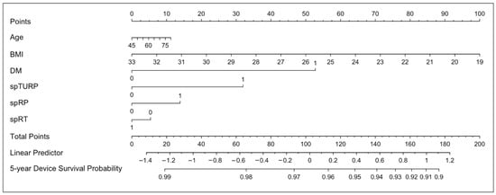A nomogram was constructed from the multivariable Cox model to estimate 5-year device survival for each patient (Figure 4). Key predictors in the nomogram included age, BMI, diabetes, prior TURP, radical prostatectomy, and pelvic radiotherapy. Higher BMI and absence of diabetes favor better outcomes, supporting more precise and tailored risk assessment for patients.