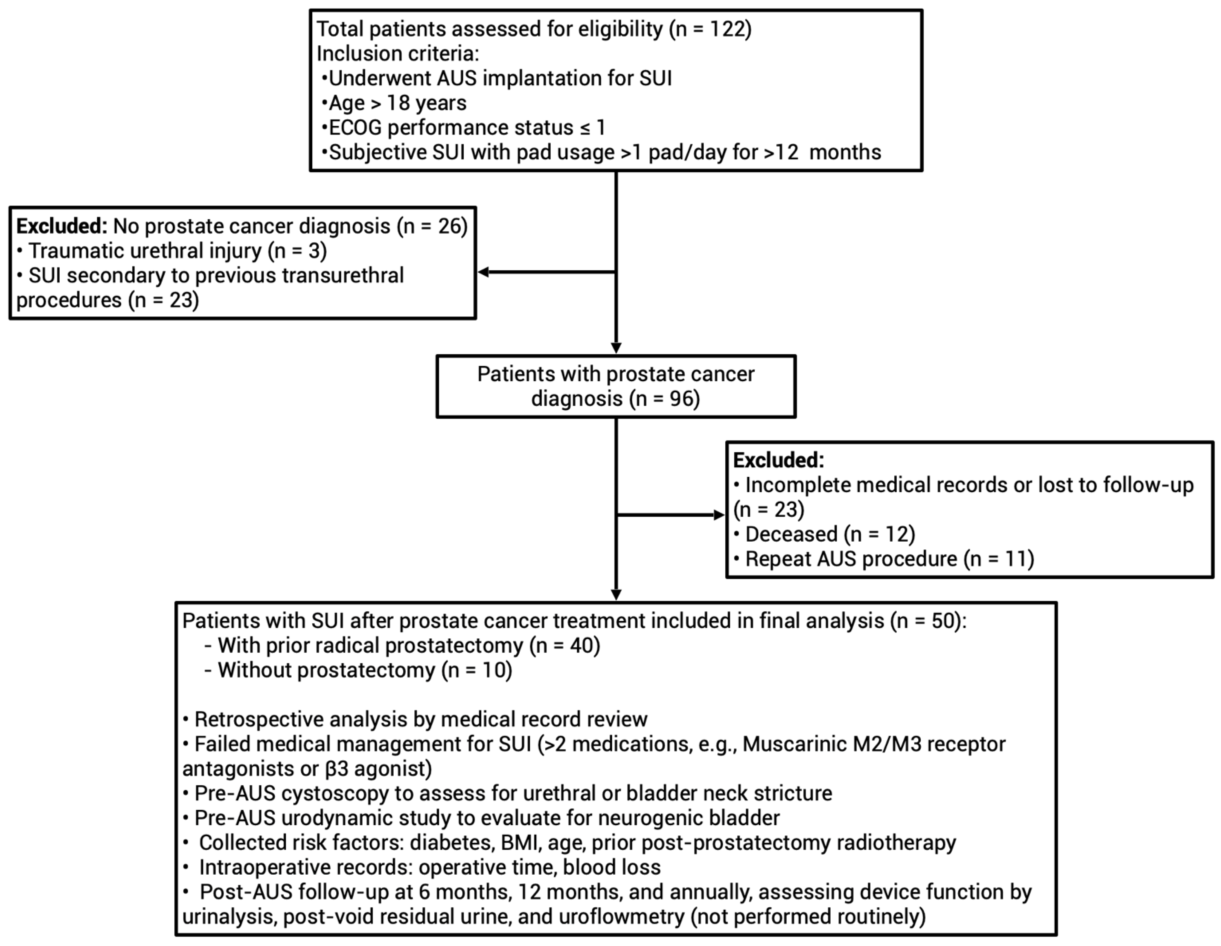 - Pitout, A.; Lecoanet, P.; Mazeaud, C.; Gaillard, V.; Poussot, B.; Tricard, T.; Saussine, C.; Brierre, T.; Game, X.; Beraud, F.; et al. Risk Factors for Artificial Urinary Sphincter Explantation and Erosion in Male Nonneurological Patients. Int. Neurourol. J. 2024, 28, 147–155. [Google Scholar] [CrossRef]