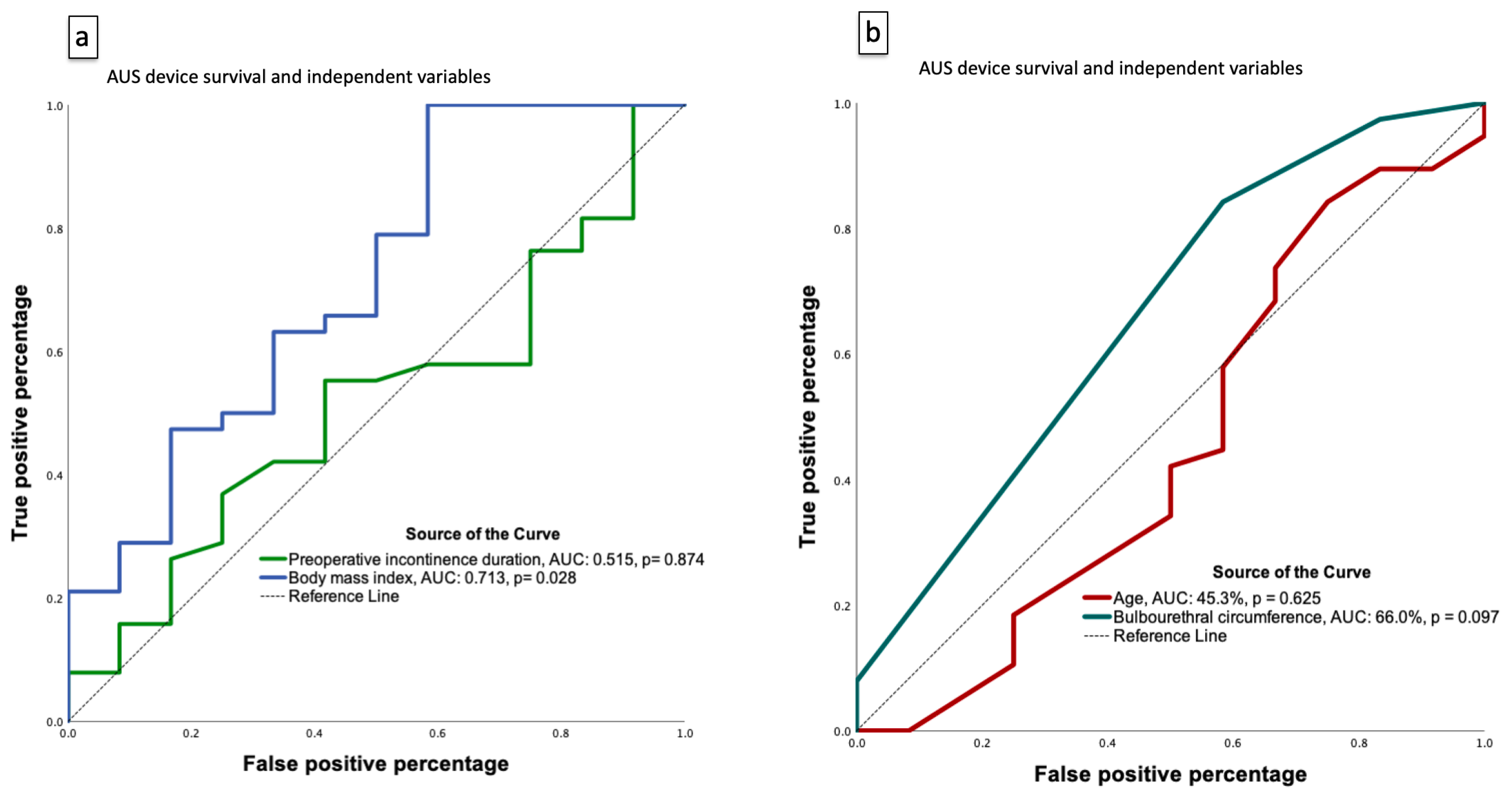 | 10-year AUS device survival, n (%) | 20 (40) | 4 (30.8) | 16 (43.2) | 0.430 |