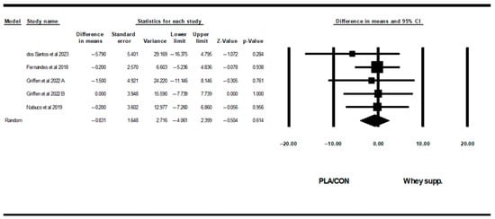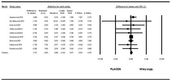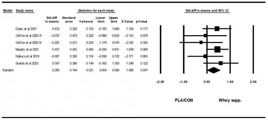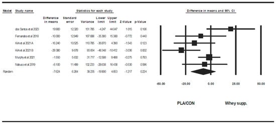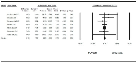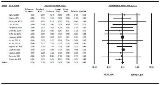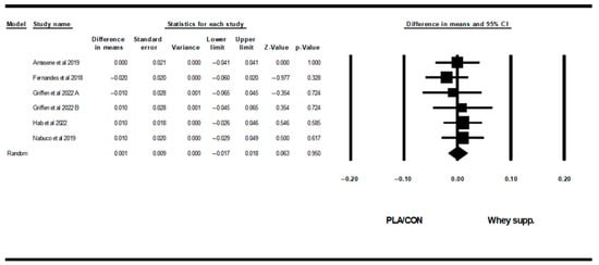 Also, WP supplementation is combined with resistance training, did not alter fat mass [WMD = −0.10 kg, (95% CI: −0.63 to 0.41), p = 0.68], BF% [WMD = 0.20%, (95% CI: −0.36 to 0.77), p = 0.47], LBM [WMD = −0.20 kg (95% CI: −0.55 to 0.14), p = 0.24], WC [WMD = −0.39 cm (95% CI: −4.17 to 3.37), p = 0.83], WHR [WMD = 0.00 (95% CI: −0.01 to 0.01), p = 0.96], fasting glucose [WMD = −0.75 mg/dl, (95% CI: −6.73 to 5.23), p = 0.80], fasting insulin [SMD = 0.27 (95% CI: −0.10 to 0.64), p = 0.15], TCH [WMD = −6.87 mg/dl (95% CI: −21.17 to 7.41), p = 0.34], LDL [WMD = −11.19 mg/dl (95% CI: −24.24 to 1.86), p = 0.09], HDL [WMD = 0.12 mg/dl (95% CI: −5.16 to 5.42), p = 0.96], upper-body muscular strength [SMD = 0.02 (95% CI: −0.19 to 0.23), p = 0.83], in comparison with PLA/CON. On the other hand, in this subgroup, lower-body muscular strength increased significantly [SMD = 0.17 (95% CI: 0.02 to 0.32), p = 0.02].