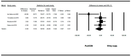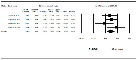 In the field of gerontology, an inverse correlation between muscular strength and all-cause mortality, cardiovascular mortality, and the development of multiple chronic diseases has been shown [80]. Furthermore, the presence of frailty and sarcopenia, are significant contributors to cardiometabolic abnormalities, and risk of cardiovascular diseases [81], mediated by insulin resistance and chronic inflammation [82]. Our study shows the potential positive role of WP supplementation on lower-body muscular strength in older adults, that may be associated with greater functional capacity and higher quality of life [83]. This finding is at odds with the results of previous meta-analyses, which reported an absence of a significant beneficial effect on muscular strength, physical performance, or body composition in older adults [31,74]. Compared with Naclerio and Larumbe-Zabala (2016), who included resistance-trained adults aged 18 to 50 years, found that whey protein alone did not significantly improve either upper- or lower-body strength [84]. Meanwhile, our mixed results showed no significant change in upper-body strength but a significant increase in lower-body strength, suggesting potential age or training status-related differences in responsiveness to whey protein [84].