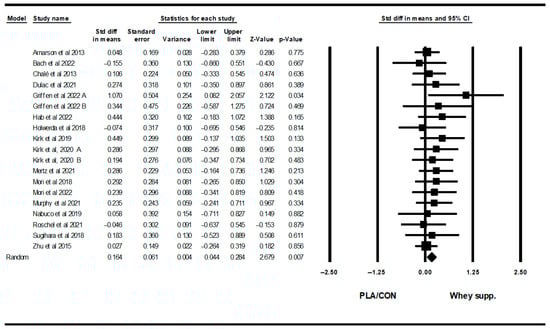 WP supplementation did not change upper-body muscular strength [SMD: 0.06 (95% CI: −0.08 to 0.20), p = 0.40; 19 trials], but increased lower-body muscular strength [SMD: 0.16 (95% CI: 0.04 to 0.28), p = 0.007; 15 trials] significantly more than PLA/CON (Figure 14 and Figure 15).