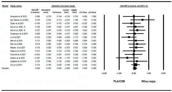 To investigate the effects of WP against PLA/CON groups for each outcome, separate meta-analyses were conducted using Comprehensive Meta-Analysis version 3 (CMA3) software. Effect sizes were determined according to measurement method units, where we used weighted mean differences (WMDs) or standardized mean differences (SMDs) with 95% confidence intervals (CIs) when units were the same or different, respectively. Random effects models were used to calculate effect sizes and generate forest plots. Subgroup analyses were conducted based on WP with and without exercise training. Heterogeneity was assessed using I2 and Cochrane Q statistics, and I2 was interpreted as low (<25%), moderate (25% to <50%), and high (50% to <75%) heterogeneity [47]; whereas Q was significant if p < 0.05. Publication bias was assessed using the visual interpretation of funnel plots and significant Egger’s test results if p < 0.10. The trim and fill method was used to correct the effect sizes when there was publication bias based on the visual interpretation of funnel plots. To evaluate the stability of results, sensitivity analysis was performed by removing individual studies. In addition, subgroup analyses of WP supplementation with and without resistance training, were performed when at least three studies were available for each subgroup.