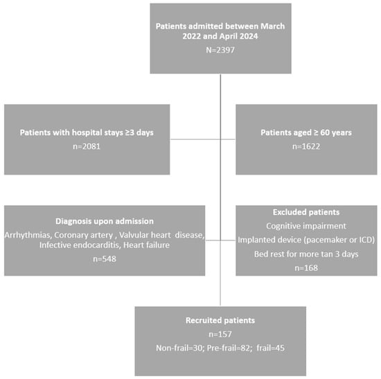 A cross-sectional observational study was conducted in a cohort of patients admitted to a conventional cardiology inpatient unit of a tertiary care hospital in the Spanish public health network in the region of Castilla y León between March 2022 and April 2024. The study included conscious and oriented individuals aged 60 years or older who had been diagnosed with coronary artery disease, infective endocarditis, heart failure, arrhythmias, and valvular heart disease according to the cardiovascular disease models defined by scientific societies [29]. A threshold of 60 years old was selected to capture early frailty transitions, as physical decline and muscle mass loss can begin before the age of 65. Patients with previously diagnosed cognitive impairment (ICD-10-CM Diagnosis Code R41.81), severe motor disability that prevented them from standing or required prolonged bed rest, wearers of pacemakers and implantable internal defibrillators (ICDs), and those with a hospital stay of less than 3 days were excluded.
