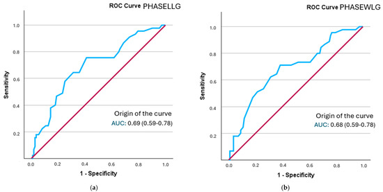 In hospitalized patients, a cut-off point for the total body phase angle has been identified as a predictor of malnutrition, with 5.3° for women (AUC = 0.815; sensitivity = 0.703; specificity = 0.635) and 5.4° for men (AUC = 0.851; sensitivity = 0.821; specificity = 0.779) [21]. Similarly, in a study conducted with patients in an intensive care unit, those who survived the process had a higher mean phase angle value than those who died, with a cut-off point of 4.6° (AUC = 0.63; 95% CI = 0.58–0.70; sensitivity = 0.080; specificity = 0.049) [22].