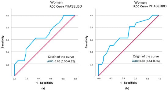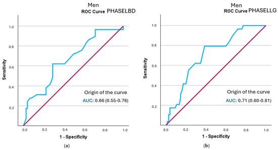 Similarly, the analysis by sex revealed a lower predictive capacity of phase angles in women, which may be attributed to a smaller sample size in this subgroup and potential uncontrolled physiological differences or measurement biases. We should note that no sample size calculation was performed by sex.