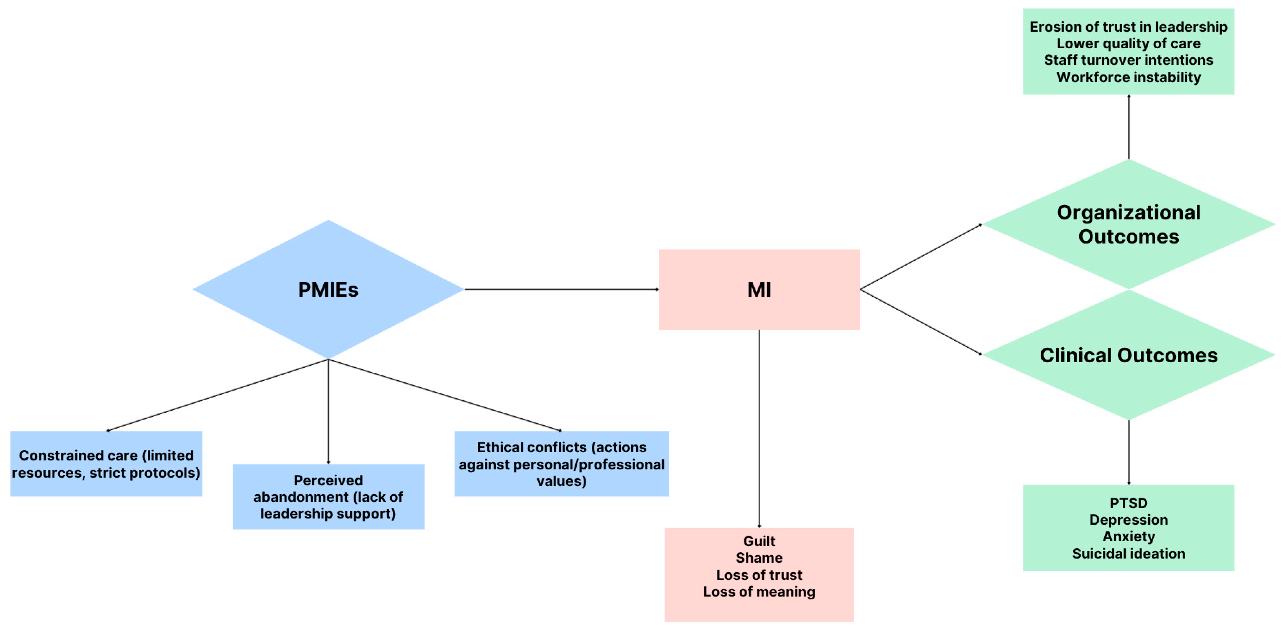 11]. Furthermore, moral injury has been strongly correlated with post-traumatic stress disorder (PTSD), depression, anxiety, and suicidal ideation, underscoring its long-term implications for the mental health and retention of healthcare workers [