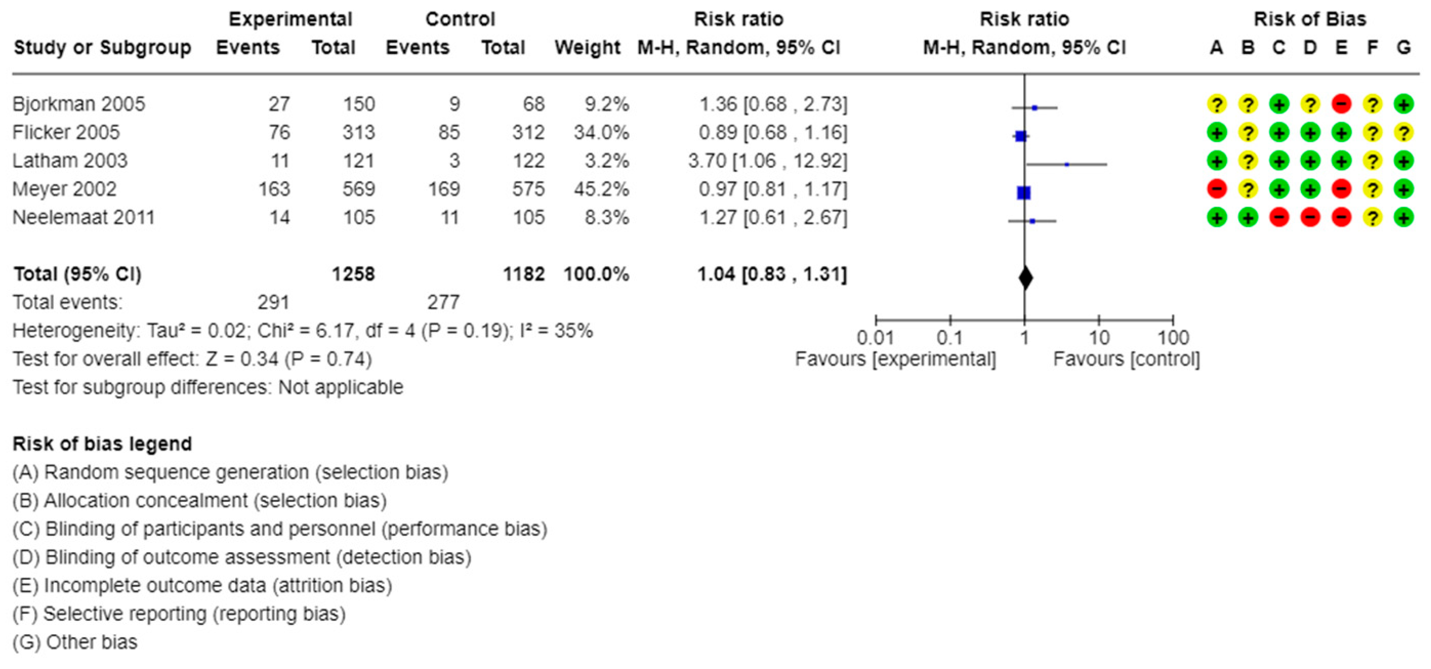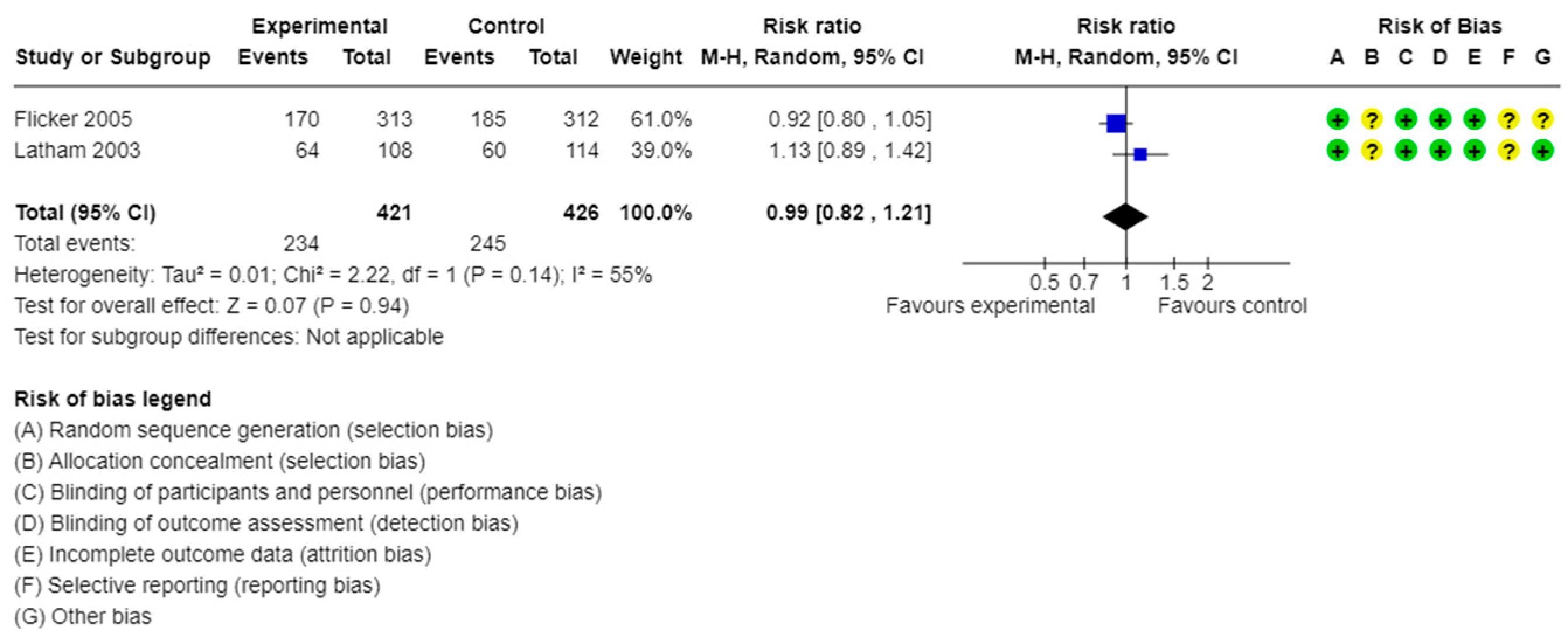 | At least one fall | 2 studies/847 participants | RR: 0.99, 95% CI: 0.82 to 1.21 | I2 = 55% | Moderate | ||