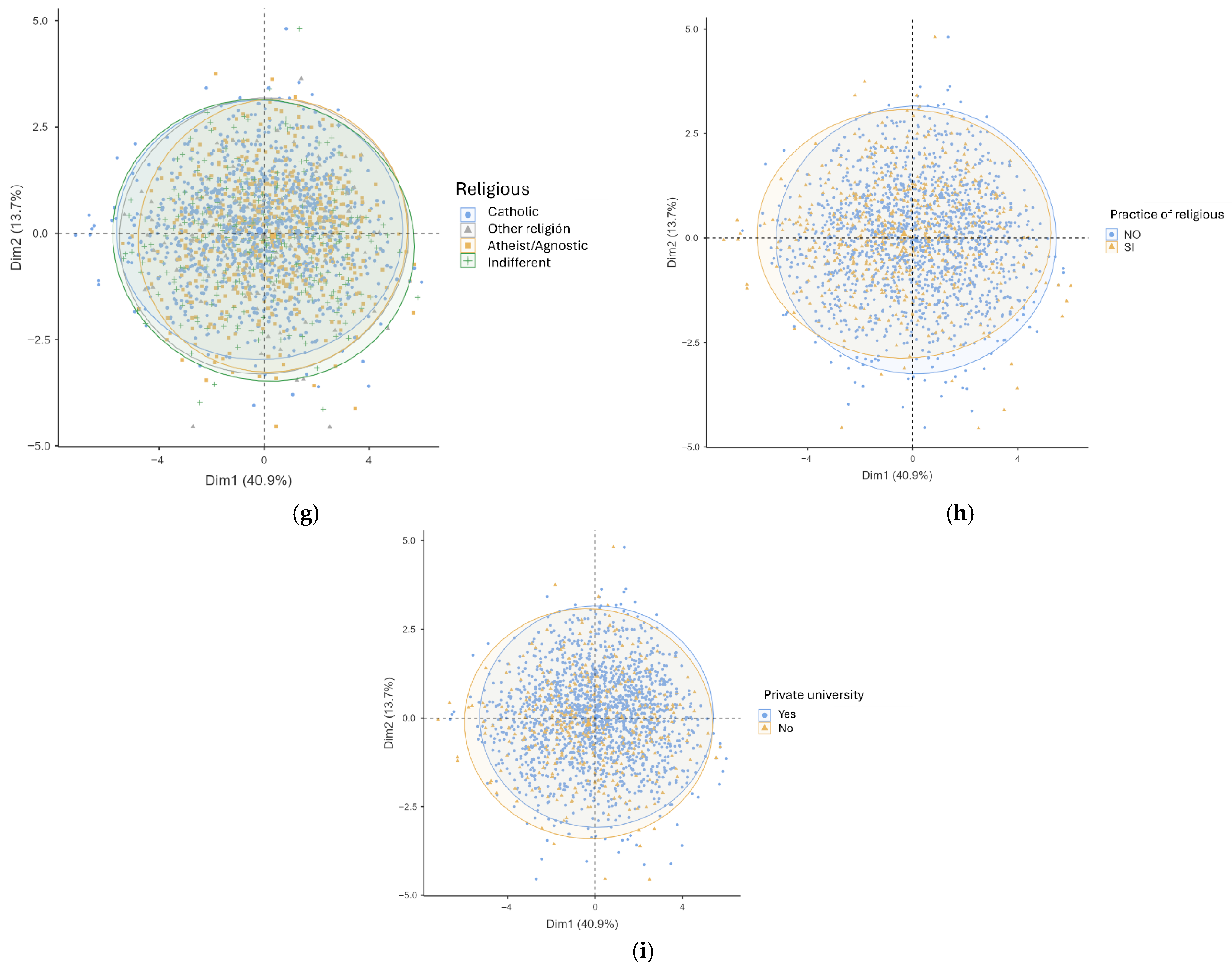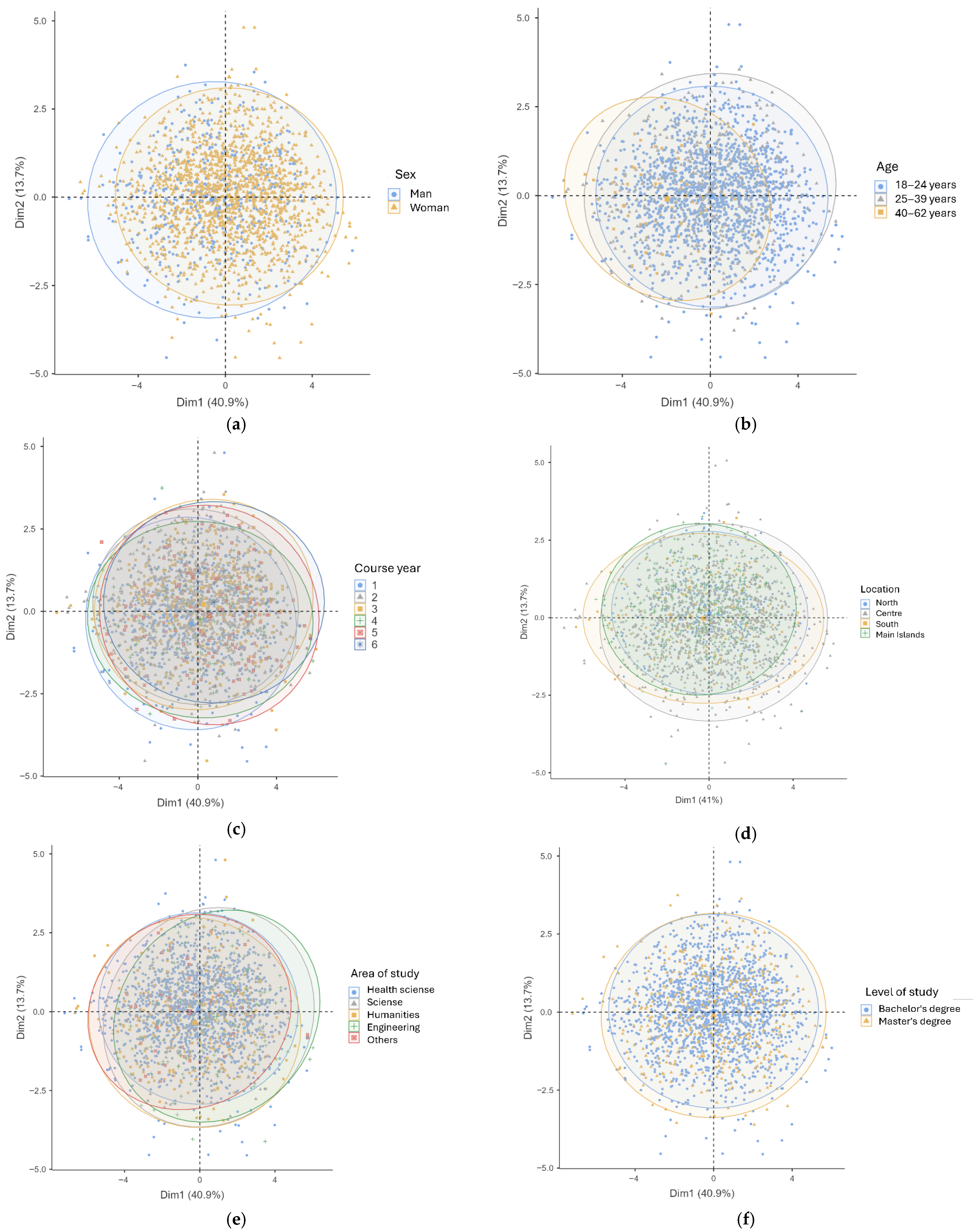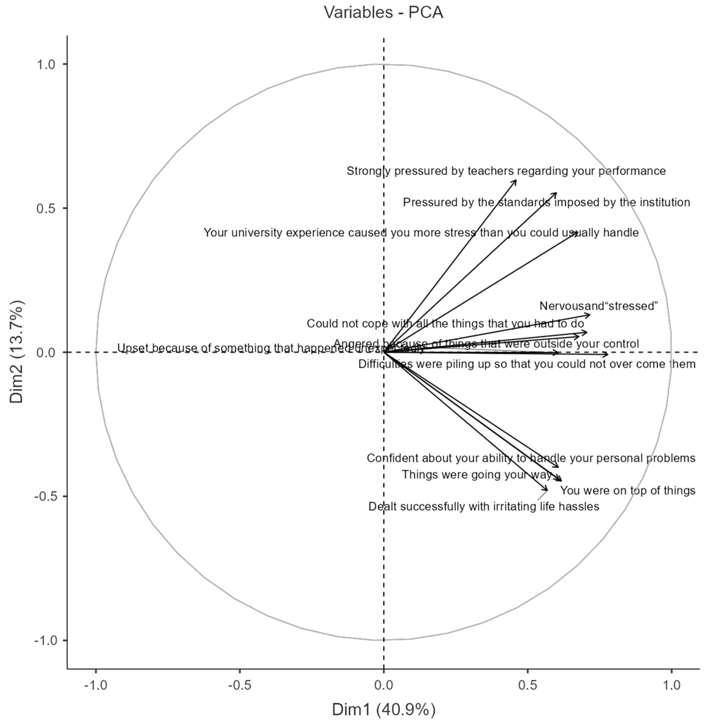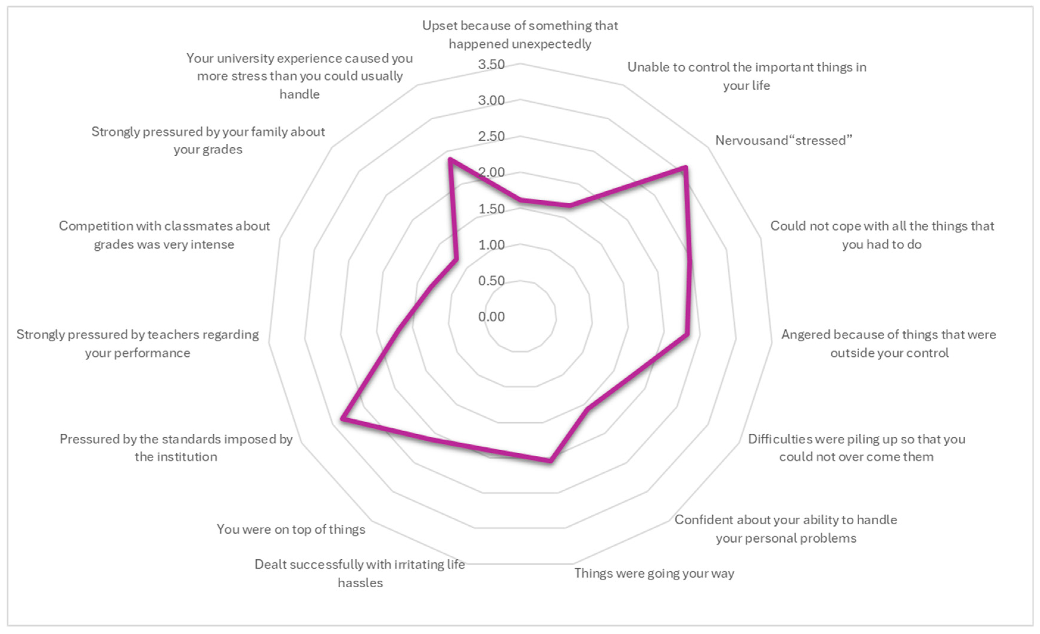- Higher stress is observed in women, younger and first-year students, and those in Health Sciences/STEM, whereas lower stress/better coping is observed in older and postgraduate students and in Southern/Islands; private universities show higher academic pressure.