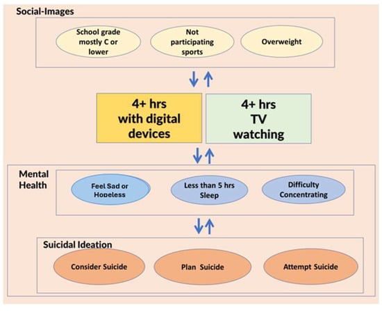 Conceptual model of the relationships among screen time, mental health, suicidal ideation and behavior, and social image factors.