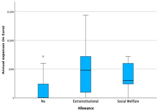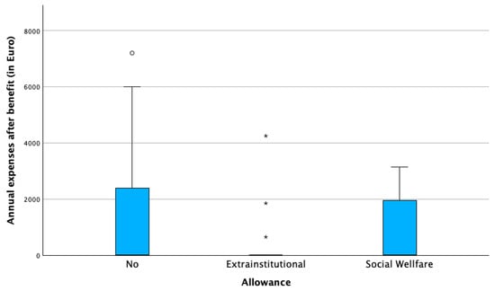 Allowance status played a key role. Families receiving the extra-institutional allowance (€846/month) reported the highest absolute expenses and the most frequent unexpected costs. While this allowance reduced net financial burden, in 18% of families, expenses still exceeded the total allowance. Families receiving the lower social allowance (€338/month) consistently reported uncovered monthly costs. Those without allowances incurred fewer direct expenses but remained financially vulnerable. Table 2 shows the number of patients towards the receipt of the allowance and Figure 1 and Figure 2 illustrate the distribution of annual expenses towards the distribution of the state allowance, before and after the benefit of the allowance.