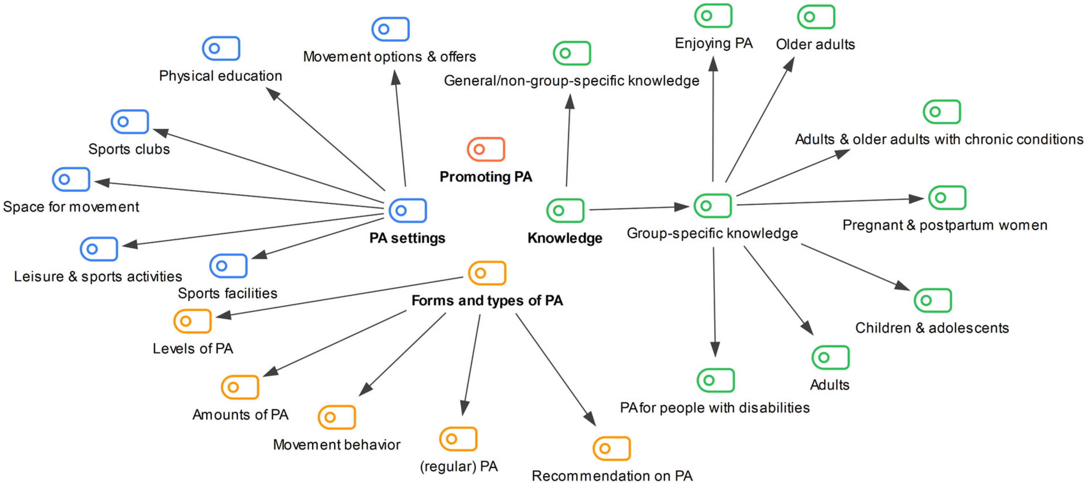 | Promoting PA | The term is coded if the promotion of physical activity is addressed. (e.g., promotion of PA, culture that promotes PA, promotion of regular PA) | No coding if measures for the promotion of coping with life are described (e.g., promotion of mobility), forms of promotion without explicit reference to the promotion of PA (e.g., promotion of freedom of action) Workplace health promotions were also not coded. |