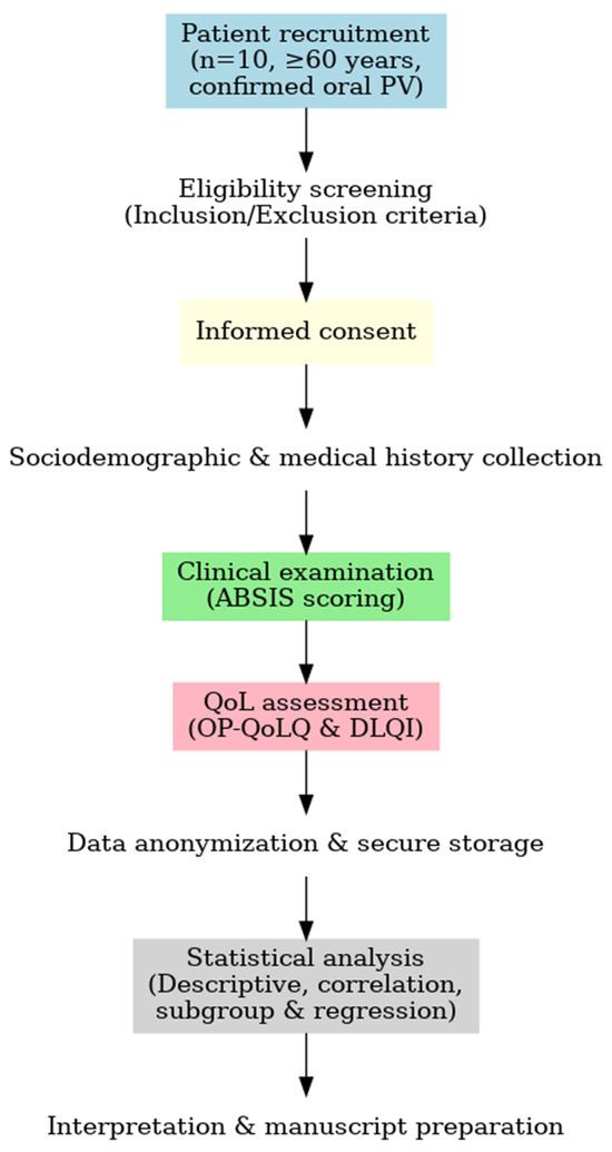Workflow of the study assessing the relationship between disease severity and quality of life in older adults with oral pemphigus vulgaris (n = 10). During eligibility screening, 2 patients were excluded due to severe cognitive impairment that prevented valid questionnaire completion.