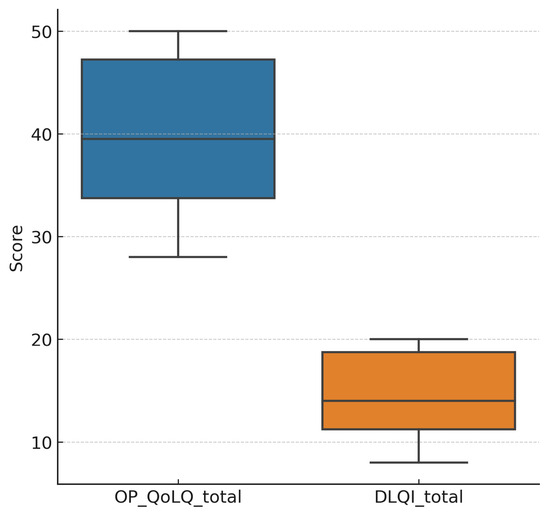 The mean OP-QoLQ total score was 38.6 ± 8.9, reflecting a moderate-to-severe quality-of-life (QoL) impact. The DLQI mean total score was 14.2 ± 4.5, corresponding to a substantial effect on daily life according to the instrument’s interpretation thresholds.