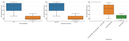 - Subgroup comparisons—Independent-samples t-tests or Mann–Whitney U tests were applied to compare QoL scores by sex, comorbidity status, and disease duration (<2 years vs. ≥2 years).