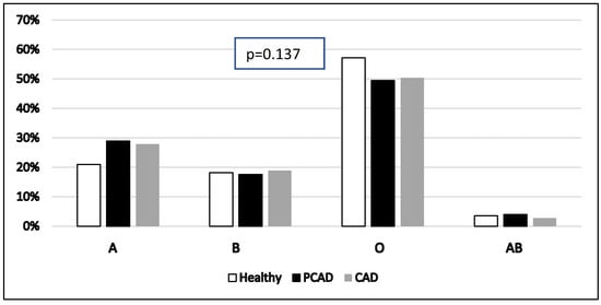 Figure 1 shows a comparison of percentages of different ABO blood groups among healthy, PCAD, and CAD groups (A = 21.0%, 28.9%, 27.9%, B = 18.2%, 17.6%, 18.9%, O = 57.2% vs. 49.5%, 50.4%, AB = 3.6%, 4.0%, 2.8%, respectively). There is no statistically significant difference among healthy individuals, PCAD patients, and CAD patients regarding ABO blood group distribution with a p = 0.137. However, one can notice that the relative percentage of “A” blood group is higher among PCAD patients and CAD patients as opposed to other blood groups which are relatively lower among cases.