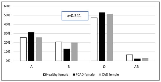 As shown in Figure 2 and Figure 3, there is a statistically significant difference in blood group distribution among healthy males, PCAD male patients, and CAD male patients (A = 19.7%, 28.1%, 28.4%, B = 17.5%, 19.0%, 18.6%, O = 60.0%, 48.3%, 50.2%, AB = 2.8%, 4.6%, 2.8%, p = 0.041, respectively). However, the difference is not statistically significant between healthy females, PCAD female patients, and CAD female patients (A = 25.5%, 31.3%, 25.7%, B = 20.7%, 13.3%, 20.0%, O = 47.2%, 53.0%, 51.4%, AB = 6.6%, 2.4%, 2.9%, p = 0.541, respectively). Furthermore, the frequency of “A” blood group is higher among males with PCAD and CAD compared to healthy males while “O” blood group is higher in healthy subjects when compared to cases.