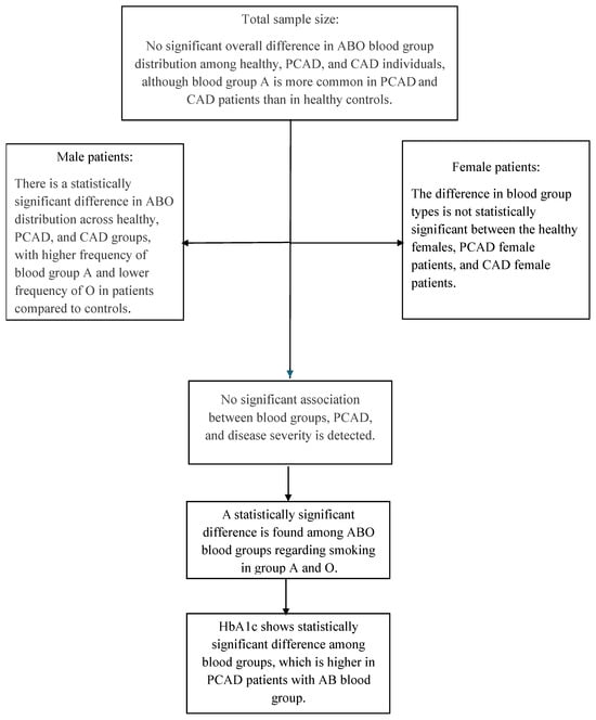 Figure 4 summarizes the correlation between ABO blood groups, PCAD, and gender differences.