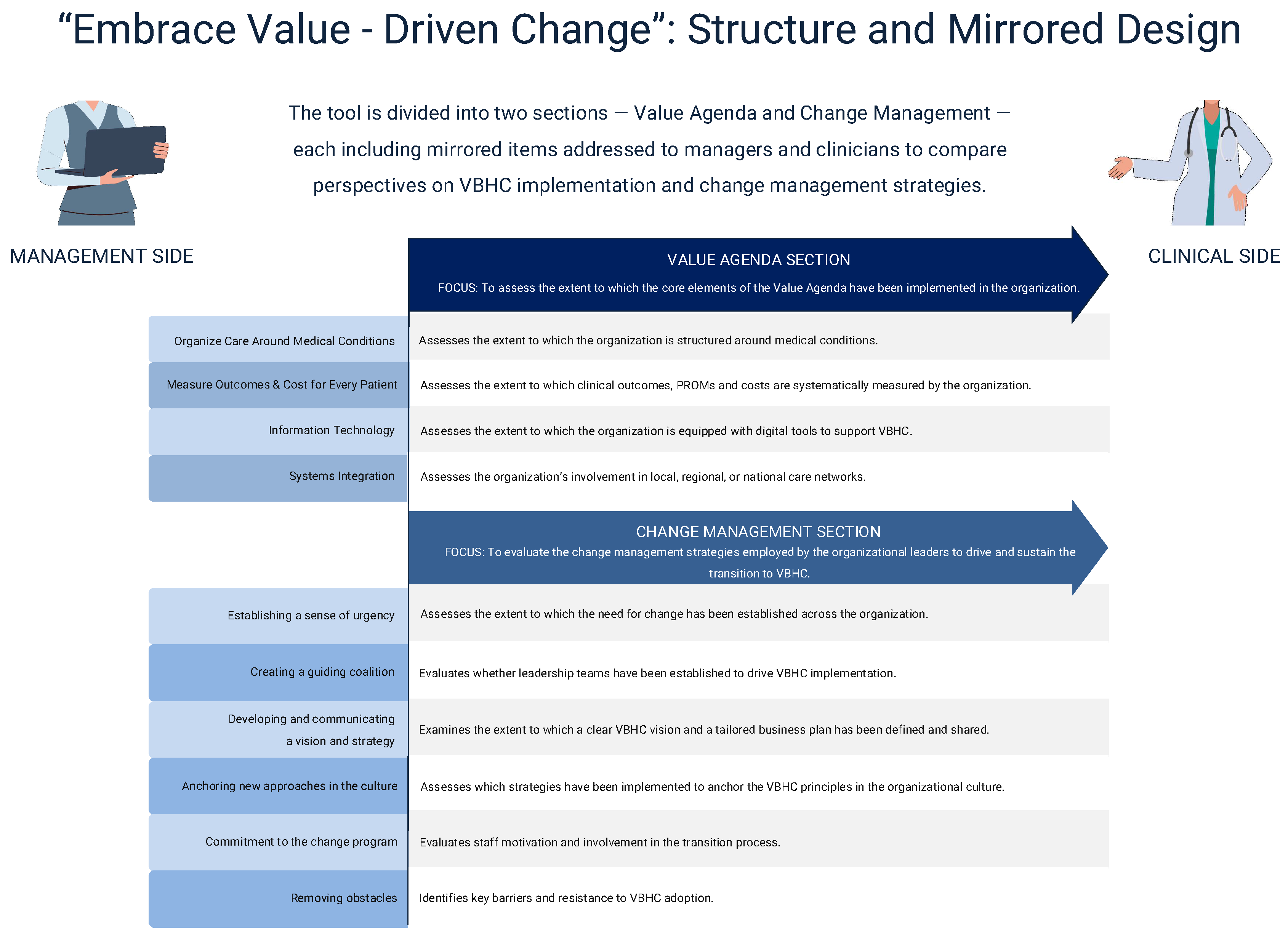 | Change management section Implementing VBHC principles within hospital dynamics require structural changes and, more importantly, cultural transformations. Indeed, for the principles of this theory to become more than just another innovation proposed within the healthcare sector and truly take root within hospital dynamics, it is essential that healthcare professionals understand and support them, and become the leading actors in this transition process. Therefore, this section aims to answer the following questions: what change management strategies did top management employ to facilitate the transition to the VBHC model? | |||||