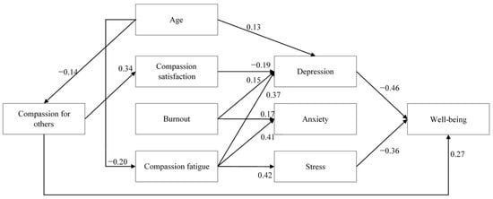Regarding the effects of gender and age, only three significant effects of age were observed: age positively predicted depression (β = 0.13, p = 0.01) and negatively predicted both compassion fatigue (β = −0.20, p = 0.01) and compassion (β = −0.14, p = 0.04). Correlations among the study variables are presented in Table 3. Overall, the model explained 46.7% of the variance in physicians’ well-being (R2 = −0.47, p < 0.01).
