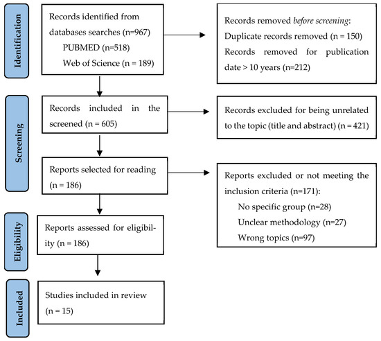 A 5-stage selection process was performed (January/February 2025) by three researchers (GGH, LHAR and SNN A total of 967 studies were identified; however, only fifteen studies were included in this review (Figure 1).