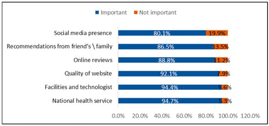 As illustrated in Figure 1, the most important factors reported by patients when choosing a medical practice were the availability of national health services (94.7%), followed closely by the quality of facilities and technology (94.4%). Other significant factors included the quality of the practice’s website (92.1%), online reviews (88.8%), recommendations from friends or family (86.5%), and the practice’s social media presence (80.1%).