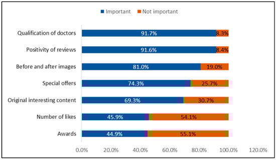 Figure 2 illustrates the factors most important to patients when reviewing a medical practice’s social media account. The top factors include the qualification of doctors (91.7%), positivity of reviews (91.6%), before-and-after images (81%), special offers (74.3%), original and engaging content (69.3%), the number of likes (45.9%), and awards (44.9%).