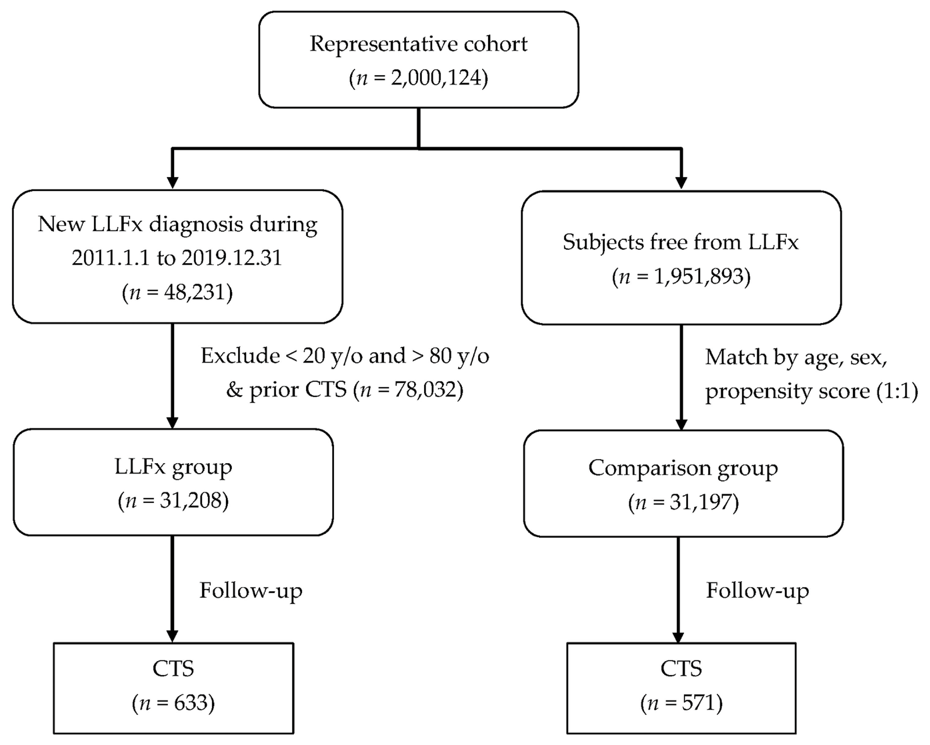 From the representative cohort, we identified all adult patients (≥20 years) diagnosed with hip, acetabular, or peri-knee fractures between 1 January 2010 and 31 December 2018. Lower-limb fractures were identified using the ICD-9-CM codes 808 (pelvis fracture), 820 (femoral neck fracture), 821 (other femoral fractures), and 823 (tibia and fibula fractures), and the ICD-10-CM codes S32 (pelvis fracture), S72 (femur fracture), and S82 (tibia and fibula fractures). The index date was defined as the date of the first LLFx diagnosis during the study period. We excluded patients with pre-existing CTS, defined as any CTS diagnosis (ICD-9-CM code 354.0; ICD-10-CM codes G56.00, G56.01, G56.02) within one year prior to the index fracture date, to ensure only incident cases were included.