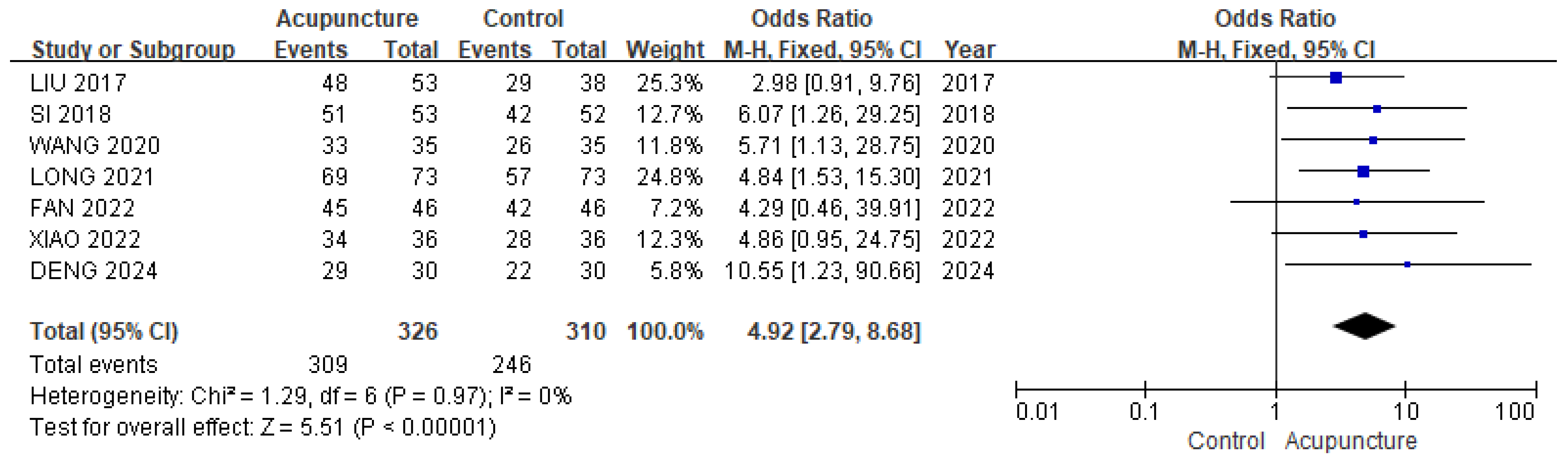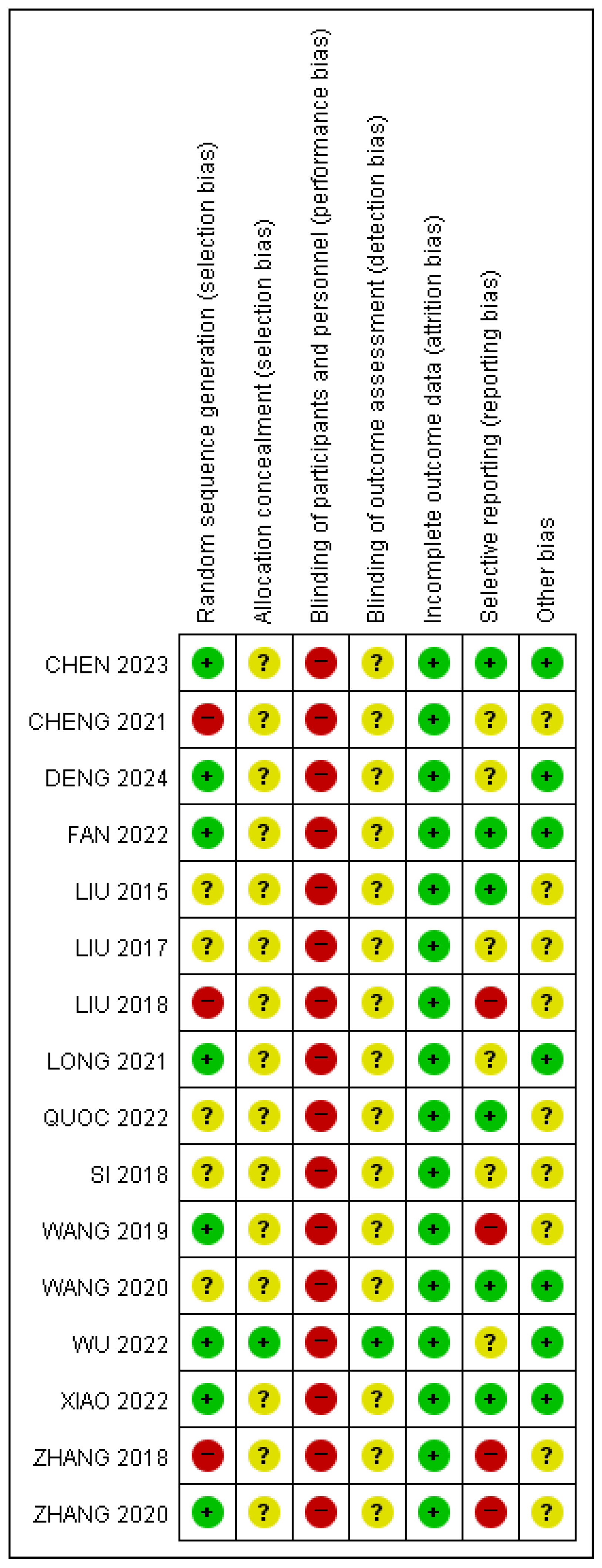 | Deng (2024) [19] | I: 12/18 C: 14/16 | I: 48.47 ± 11.36 C: 45.80 ± 14.29 | MA (PC6, BL40, EX-LE5, SP10 (Fracture side), GV20, BL17, LR3, Ashi points, 1 time a day within 2 weeks after surgery; both sides SP10, BL17, SP9, GB39, BL11, 3 times a week for 3–4 weeks after surgery; ST36, GB39, BL17, BL25, GB34, BL23, BL11, 2 times a week for 1–3 month after surgery; 30 min; twirling manipulation, reinforcing–reducing manipulation) + basic rehabilitation | Basic rehabilitation | (1) VAS (2) HSS score (3) Effective rate |