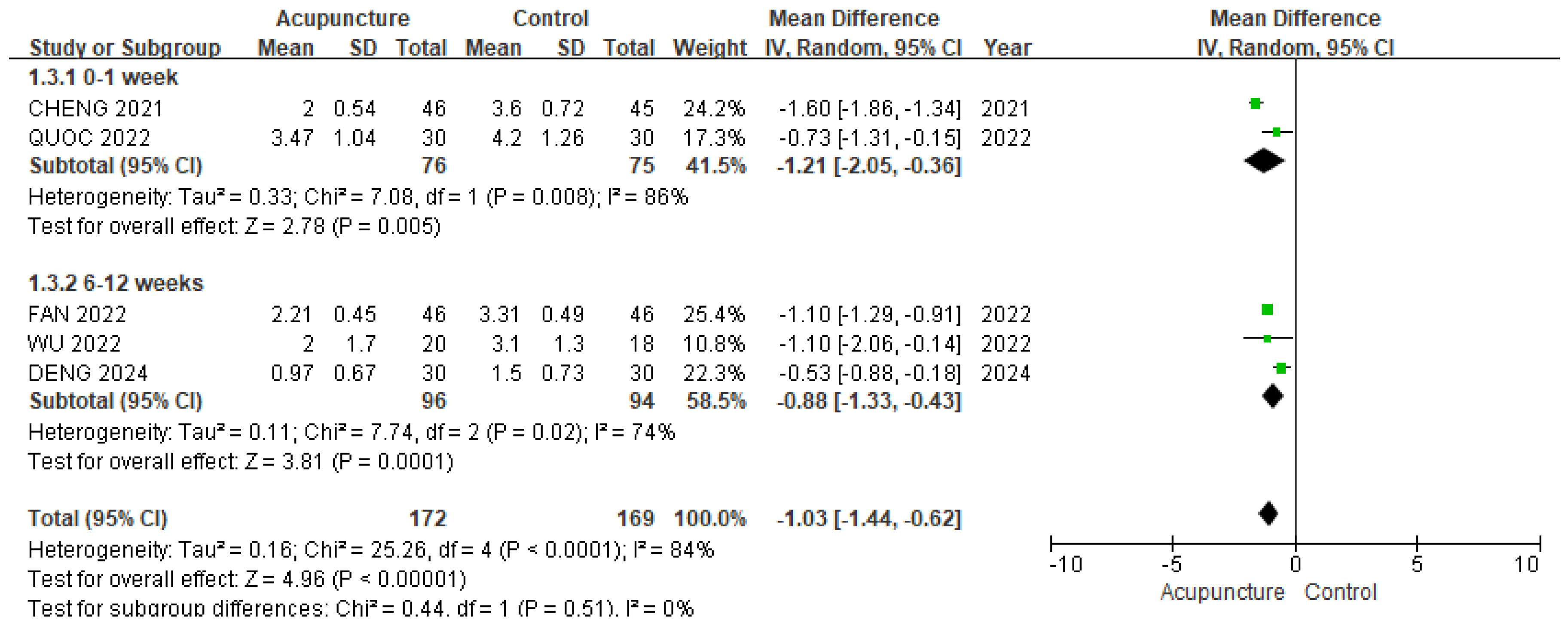 | Quoc (2022) [9] | I: 19/11 C: 18/12 | I: 37.0 ± 22.1 C: 35.6 ± 18.8 | EA (ST36, SP8, SP9, GB34, SP6, SP10; 1 time a day for 7 days; needling duration for each treatment was not presented) +Medication (Paracetamol 1 g and Ketorolac 30 mg) | Basic rehabilitation + Medication (Paracetamol 1 g and Ketorolac 30 mg) | (1) VAS |