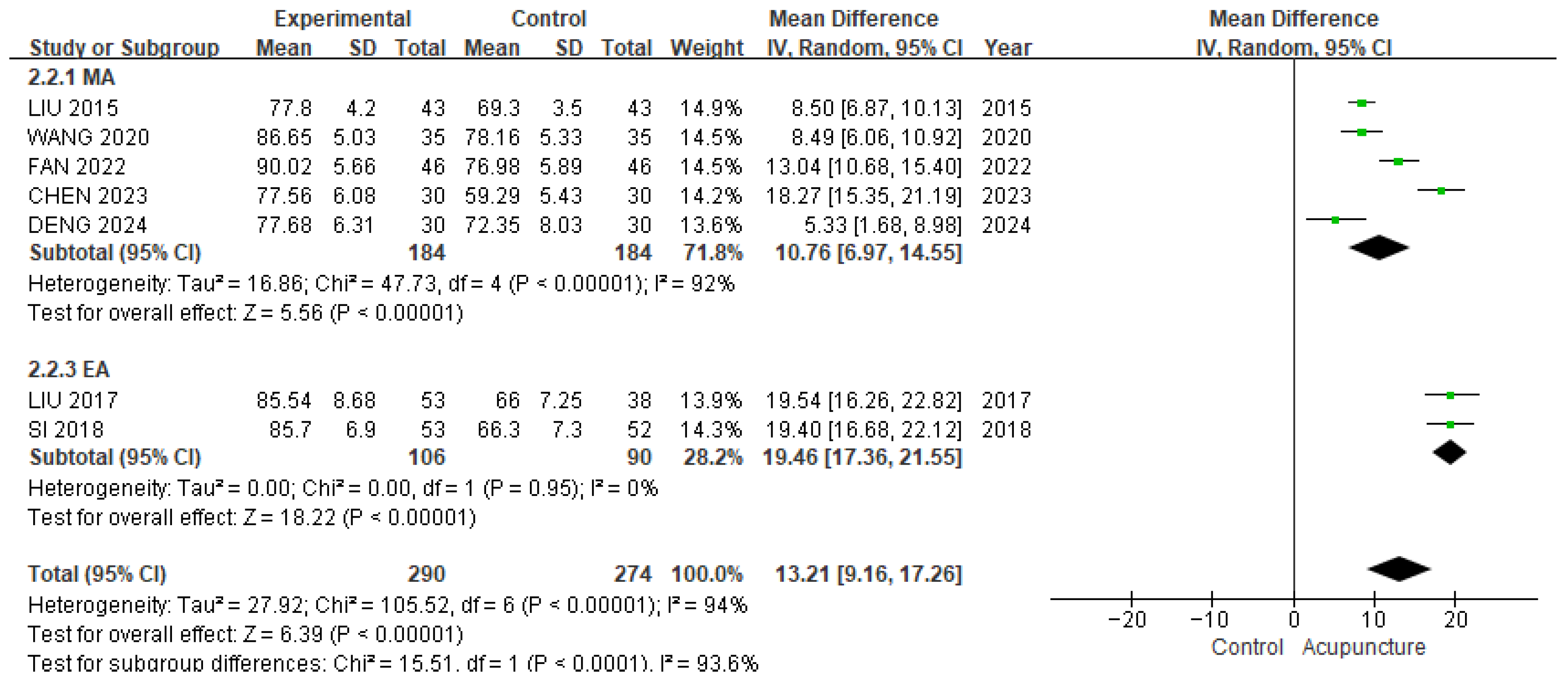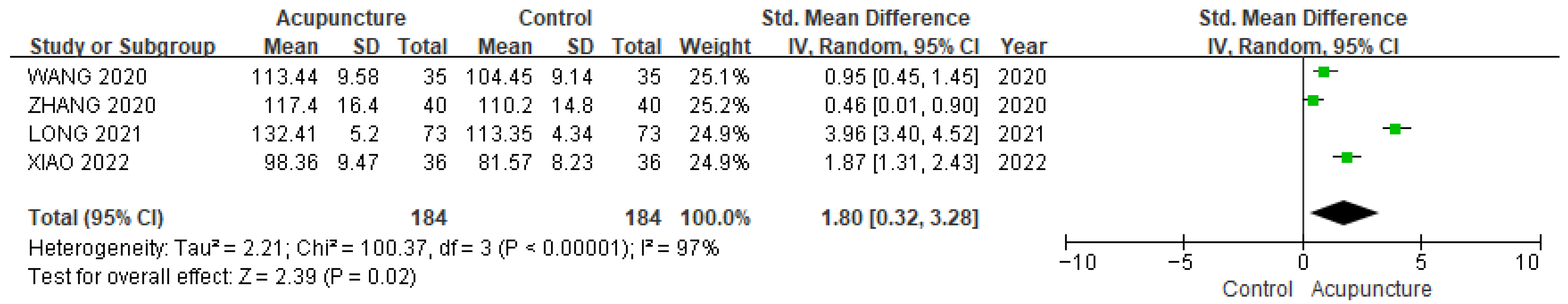 | Xiao (2022) [26] | I: 25/11 C: 23/13 | I: 44.25 ± 7.59 C: 45.39 ± 7.21 | MA (EX-LE5, BL40, ST34, ST37, EX-LE2, GB34, SP9; from 3 weeks after surgery, 1 time a day for 8 weeks, 30min; technique for receiving de qi) + basic rehabilitation | (1) ROM of knee joint (2) Effective rate (3) Incidence of complications after surgery | |