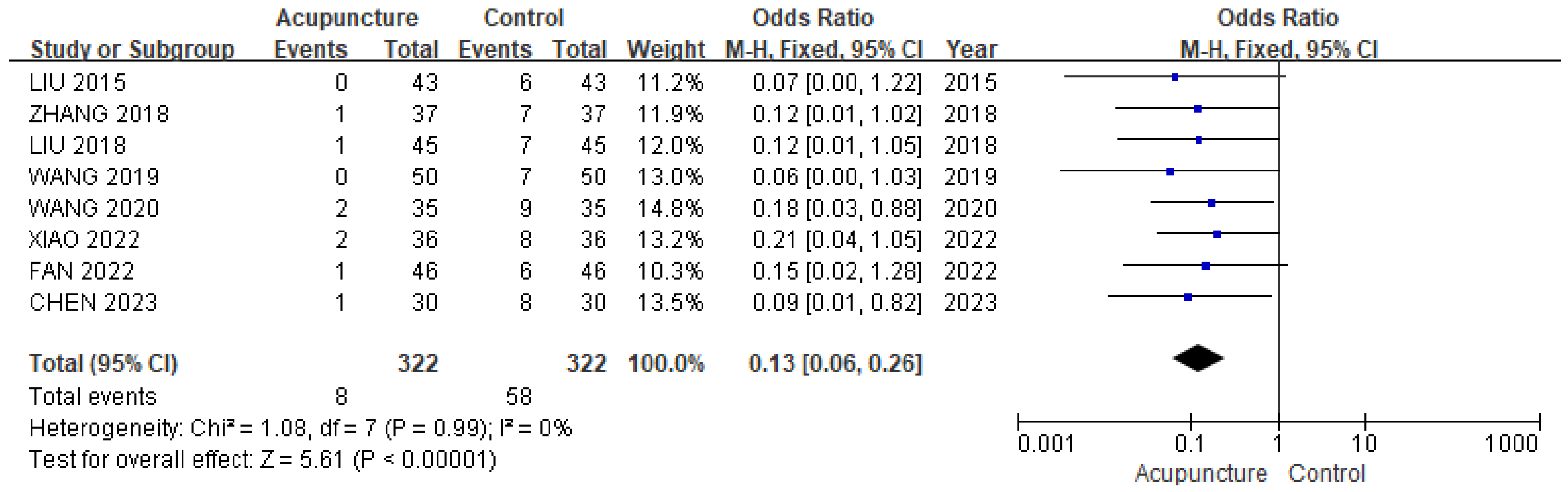 | Wang (2019) [31] | I: 21/29 C: 24/26 | I: 42.5 ± 12.6 C: 42.4 ± 12.5 | MA (ST34, EX-LE5, ST37, GB34; treatment frequency was not presented, 28 days to 3 months after surgery; 30 min) + basic rehabilitation | Basic rehabilitation | (1) Incidence of complications after surgery |