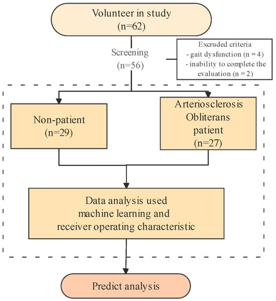 The participants were enrolled in this study from September 2023 to June 2025, as depicted in Figure 1. In the group of 62 subjects at Pusan National University Hospital, six individuals were excluded for the following reasons: (1) gait dysfunction (n = 4) and (2) inability to complete the evaluation (n = 2). In total, 56 participants (27 diagnosed with ASO and 29 healthy adults) were included in the study. Healthy control participants were recruited from the general community with no history or symptoms of peripheral arterial disease. Their vascular health was verified through detailed medical history review, absence of intermittent claudication, and confirmation of an ABI ≥ 1.00 on both sides. Individuals with borderline ABI values (0.91–0.99) or vascular comorbidities (e.g., diabetes with neuropathy, previous revascularization) were not included to ensure a truly healthy reference group.