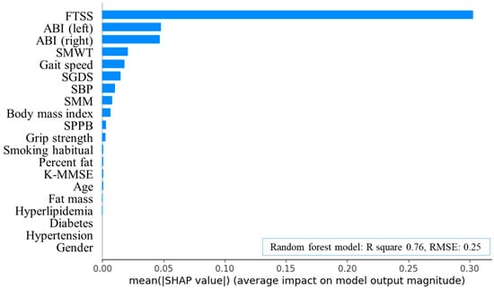 Feature importance plot of random forest algorithms in arteriosclerosis obliterans. FTSS, five times sit-to-stand test; ABI, ankle-brachial index; SMWT, six-minute walk test; SGDS, Short Geriatric Depression Scale; SBP, systolic blood pressure; SMM, skeletal muscle mass; SPPB, short physical performance battery; K-MMSE, Korean version of the Mini-Mental State Examination; R square, coefficient of determination; RMSE, root mean squared error; SHAP, Shapley additive explanations.