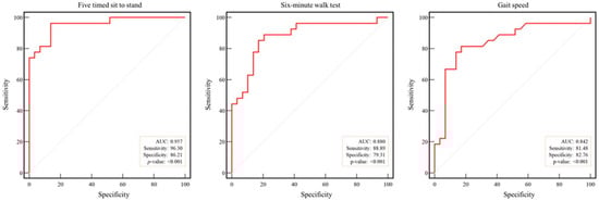ROC curve analysis demonstrated excellent diagnostic accuracy for the FTSS (AUC = 0.96), followed by the SMWT (AUC = 0.88) and gait speed (AUC = 0.84; all p < 0.001). The sensitivities were 96.30%, 88.89%, and 81.48%, and the specificities were 86.21%, 79.31%, and 82.76% for the FTSS, SMWT, and gait speed, respectively (Figure 4).