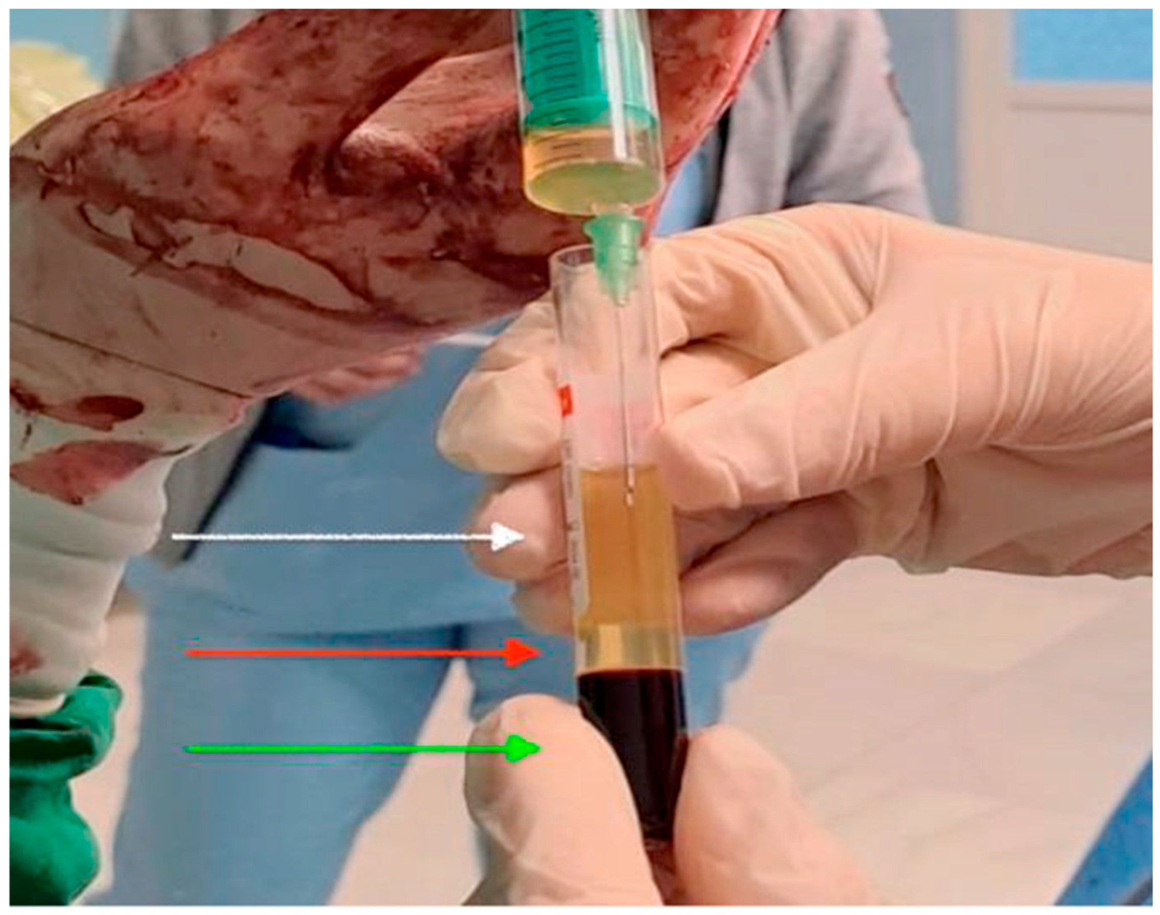 - Amable, P.R.; Carias, R.B.V.; Teixeira, M.V.T.; da Cruz Pacheco, Í.; Corrêa do Amaral, R.J.F.; Granjeiro, J.M.; Borojevic, R. Platelet-rich plasma preparation for regenerative medicine: Optimization and quantification of cytokines and growth factors. Stem Cell Res. Ther. 2013, 4, 67. [Google Scholar] [CrossRef]