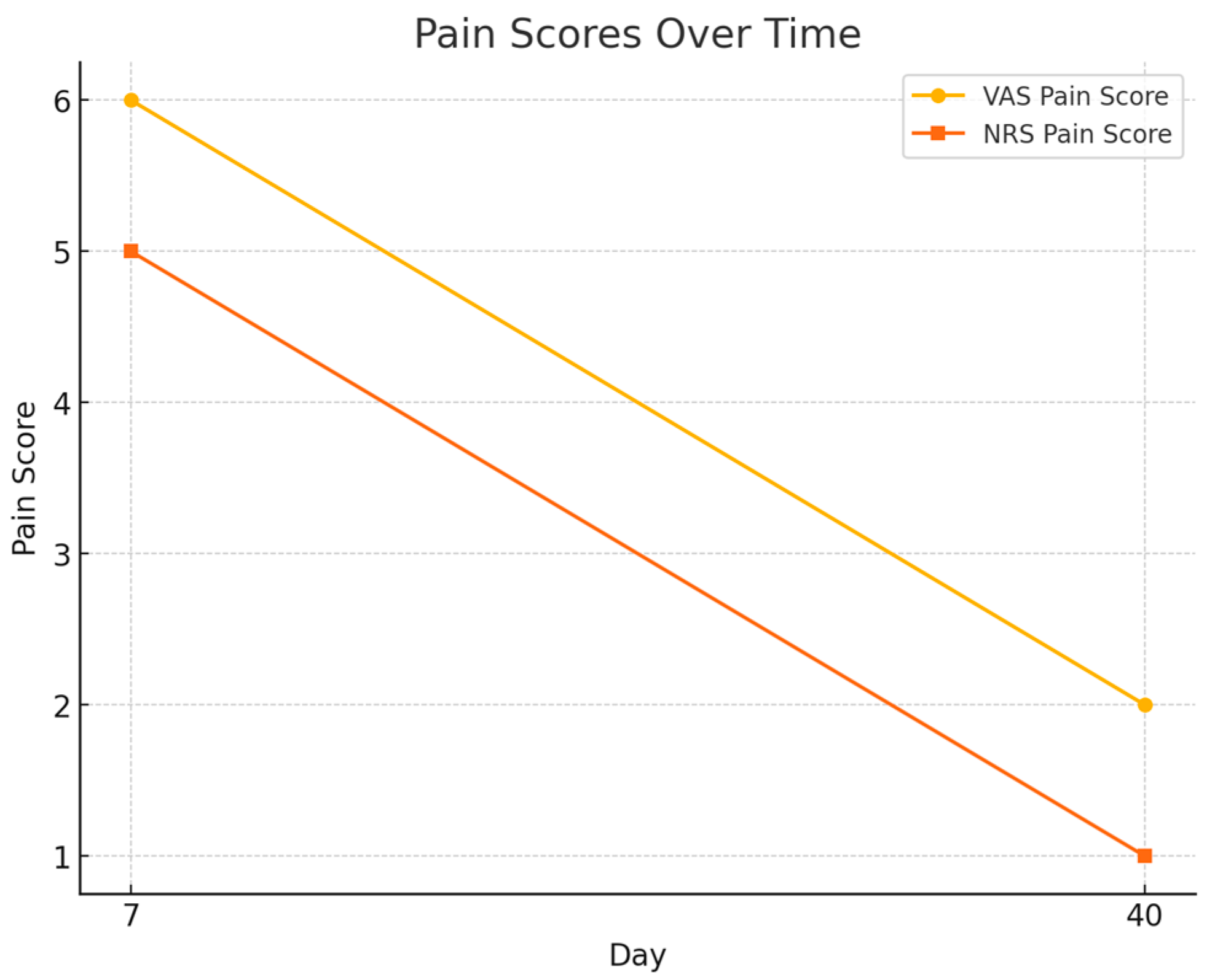 - VAS score decreased from 6.0 ± 1.5 at day 7 to 2.0 ± 0.9 at day 40.