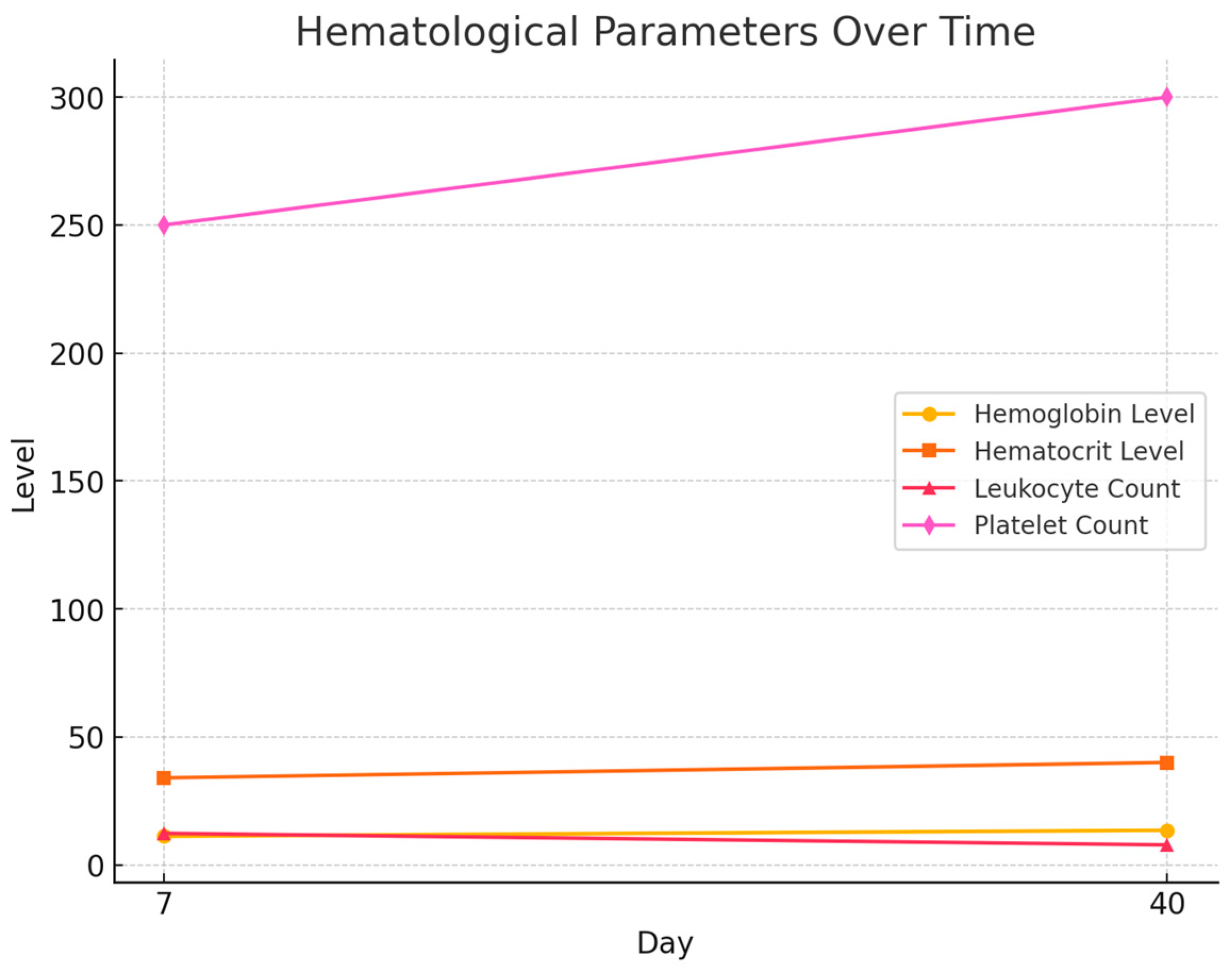 | Day | Hemoglobin (g/dL) Level Mean | Hematocrit (%) Level Mean | Leukocyte (Cells/dL) Count Mean | Platelet (Cells/dL) Count Mean |