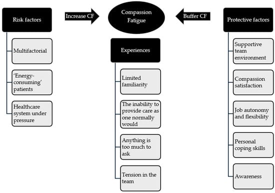 Thematic map of Compassion Fatigue (CF) showing the three major themes (Risk factors, Experiences and Protective factors) with their subthemes. Arrows indicate relations as reported by participants. Note that this map does not imply causal interference.
