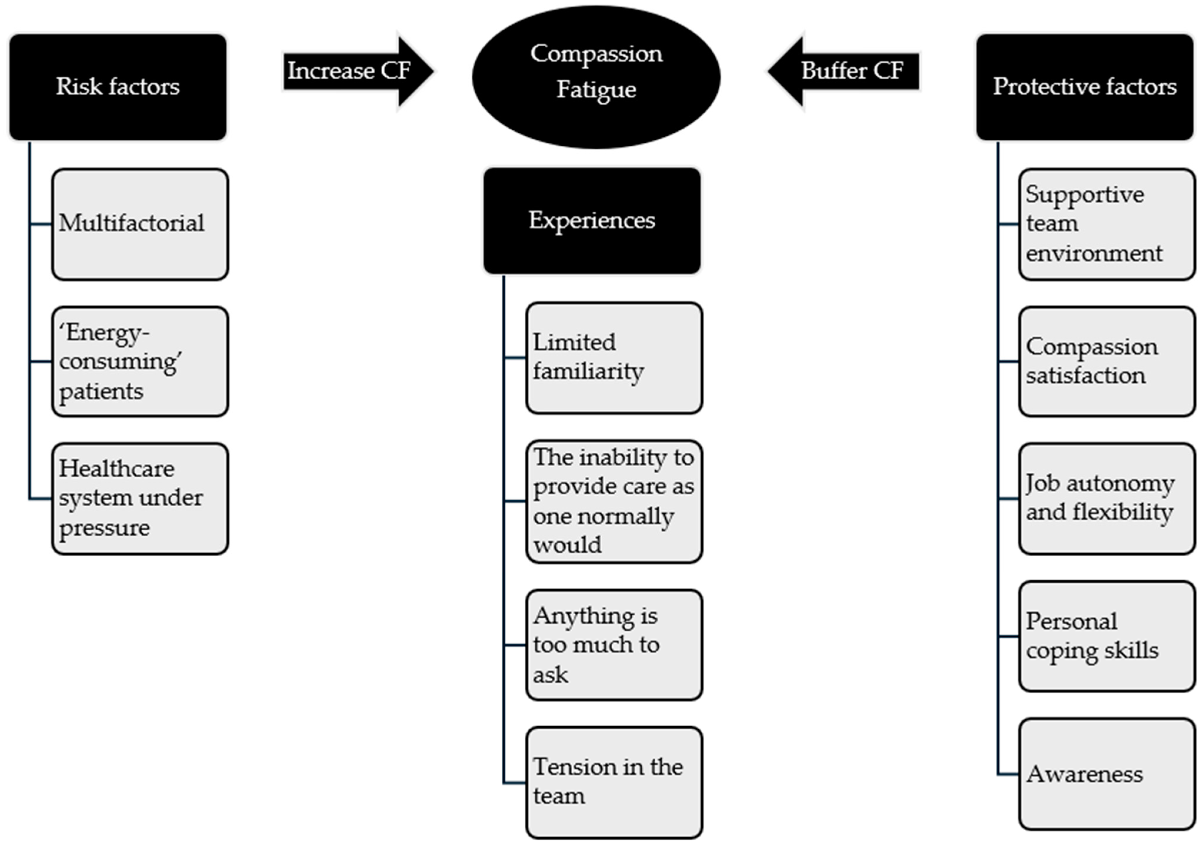 - Steinheiser, M. Compassion fatigue among nurses in skilled nursing facilities: Discoveries and challenges of a conceptual model in research. Appl. Nurs. Res. 2018, 44, 97–99. [Google Scholar] [CrossRef] [PubMed]