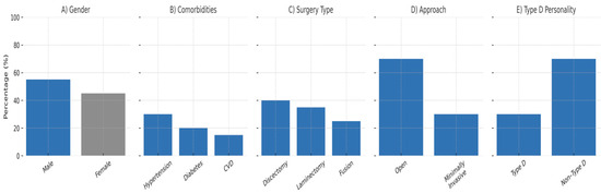 Patient demographics and clinical characteristics. (A) Gender distribution (55% male, 45% female). (B) Comorbidities including hypertension (30%), diabetes (20%), and cardiovascular disease (15%). (C) Type of surgery: discectomy (40%), laminectomy (35%), and spinal fusion (25%). (D) Surgical approach: open surgery (70%) vs. minimally invasive (30%). (E) Prevalence of Type-D personality (30%) among 200 patients. All panels display percentage (%) on the Y-axis and use a standardized blue-gray MDPI color scheme.