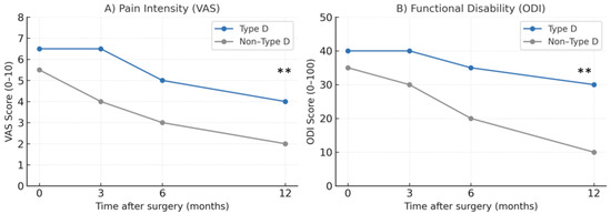 Preoperative baseline pain (VAS) was recorded for all patients to allow for a longitudinal comparison. At baseline, patients with a Type-D personality reported slightly higher pain and disability scores compared to non-Type-D patients (VAS: 6.5 vs. 5.5; ODI: 40 vs. 35). Postoperatively, Type-D patients experienced persistently higher pain intensity and slower functional recovery across all follow-up periods. At 12 months, the mean VAS score was 4.0 in Type-D patients versus 2.0 in non-Type-D patients (p < 0.01). Functional disability also remained greater in the Type-D group with ODI scores of 30 versus 10 at 12 months (p < 0.01).