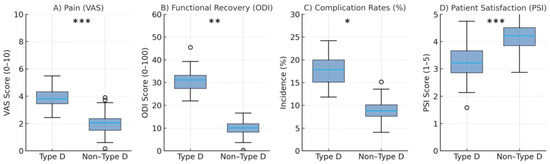 Summary of outcome differences between Type-D and Non-Type-D patients. (A) Pain levels (VAS). (B) Functional recovery (ODI). (C) Complication rates (%). (D) Patient satisfaction scores (PSI, 1–5). Boxplots illustrate higher pain and disability, greater complication rates, and lower satisfaction among Type-D patients (all p < 0.05). Boxes represent interquartile ranges (IQR), lines indicate medians, and whiskers extend to 1.5 × IQR. Significance markers are shown above each panel (A–D): * p < 0.05, ** p < 0.01, *** p < 0.001.