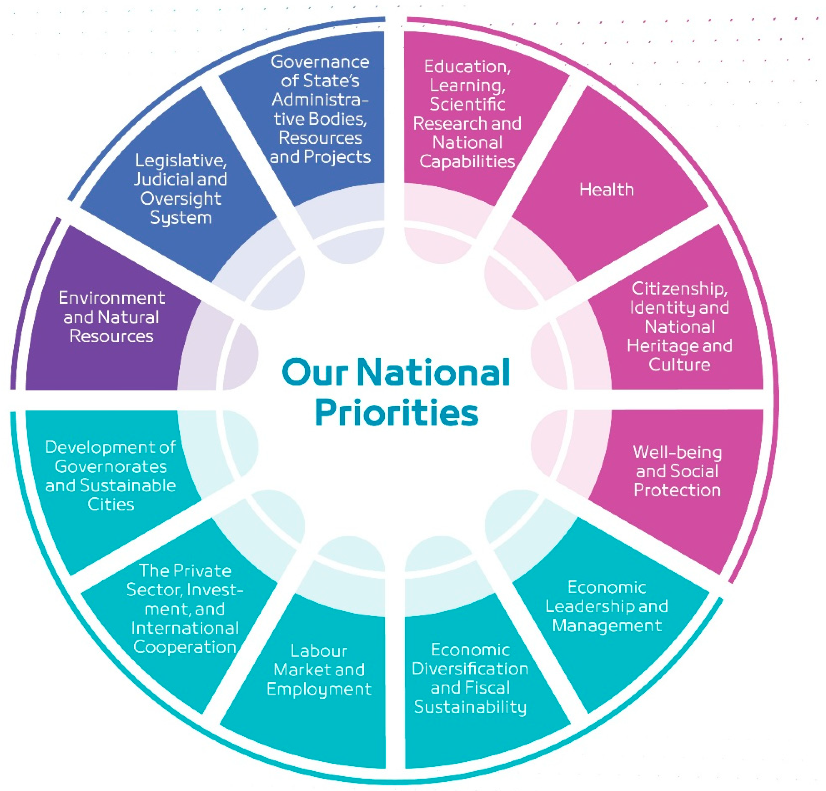 1]. This overarching ambition is to elevate the Sultanate to the ranks of developed countries across economic, social, environmental, and governance domains. This vision is structured around four foundational pillars: People and Society, Economy and Development, Sustainable Environment, and Governance and Institutional Performance, with health designated as a top priority under the “People and Society” pillar, shown in