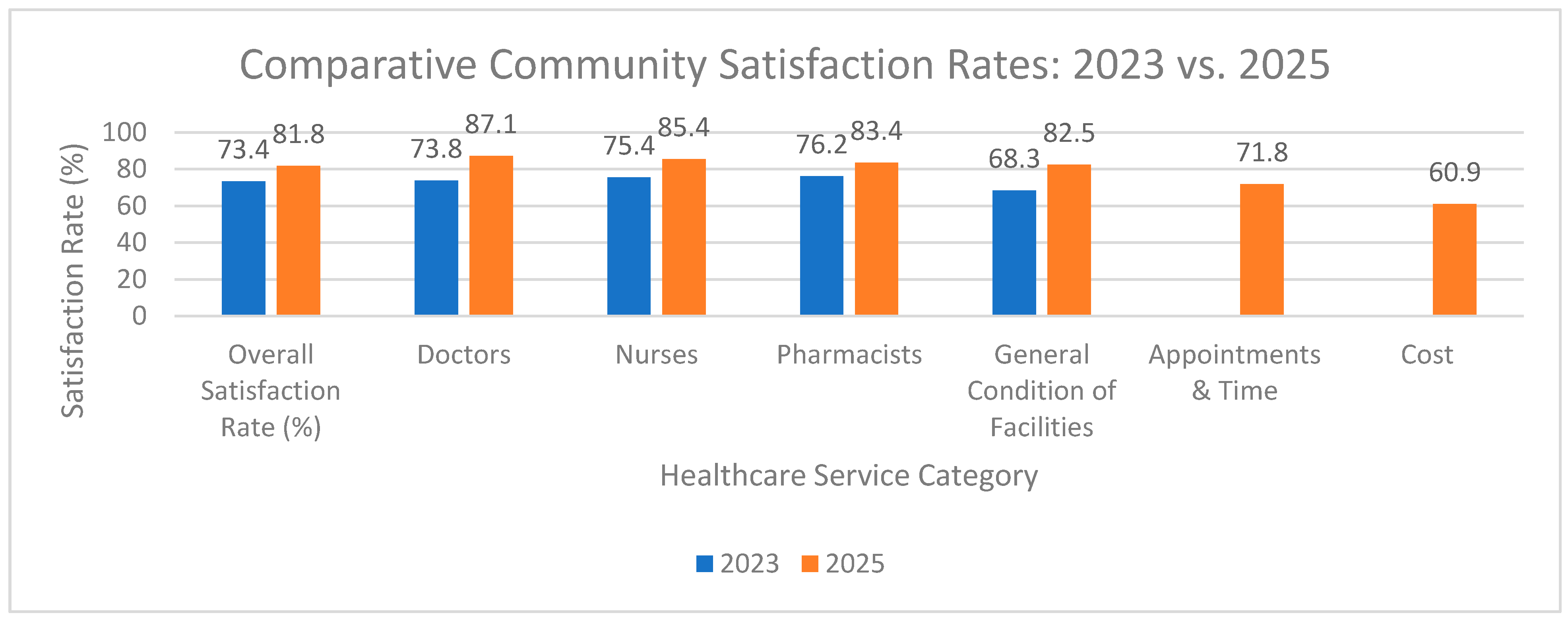 27]. These findings suggest that potential root causes, such as differences in staffing ratios or access to advanced technology, may be more pronounced in less urbanized areas. To fully address these gaps, future research should critically analyze disaggregated data from the Community Satisfaction Survey by geographic location and other socioeconomic factors to provide a more precise, evidence-based measure of these disparities and inform targeted policy interventions.