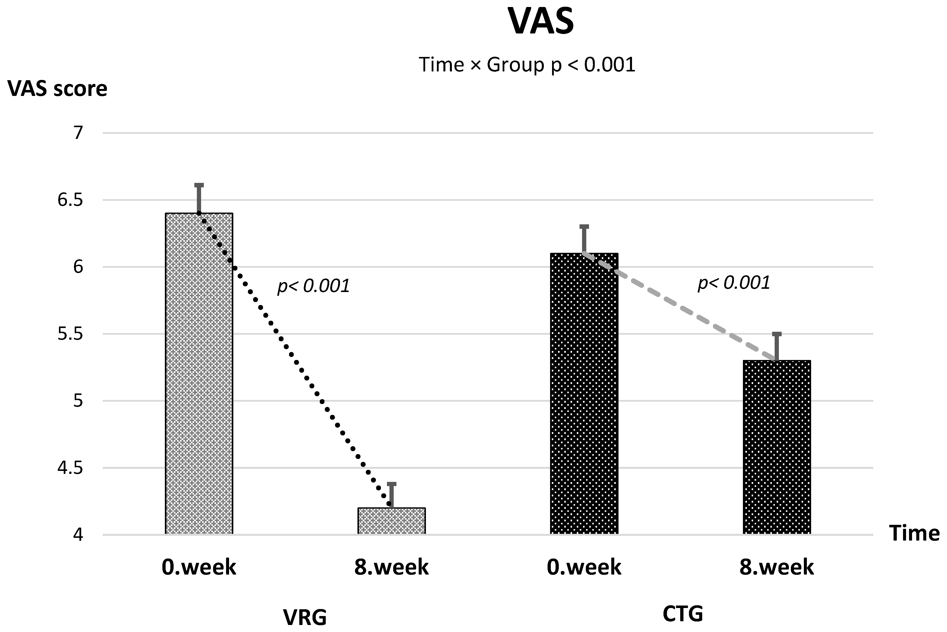 | VAS, 0–10 cm | −0.26 [−0.84–0.32] | 0.74 (1, 59.4) | 0.387 | −2.22 [−2.50–−1.93] | 232.3 (1, 59.4) | <0.001 | −1.37 [−1.73–−1.00] | 56.31 (1, 59.4) | <0.001 | 0.487 |