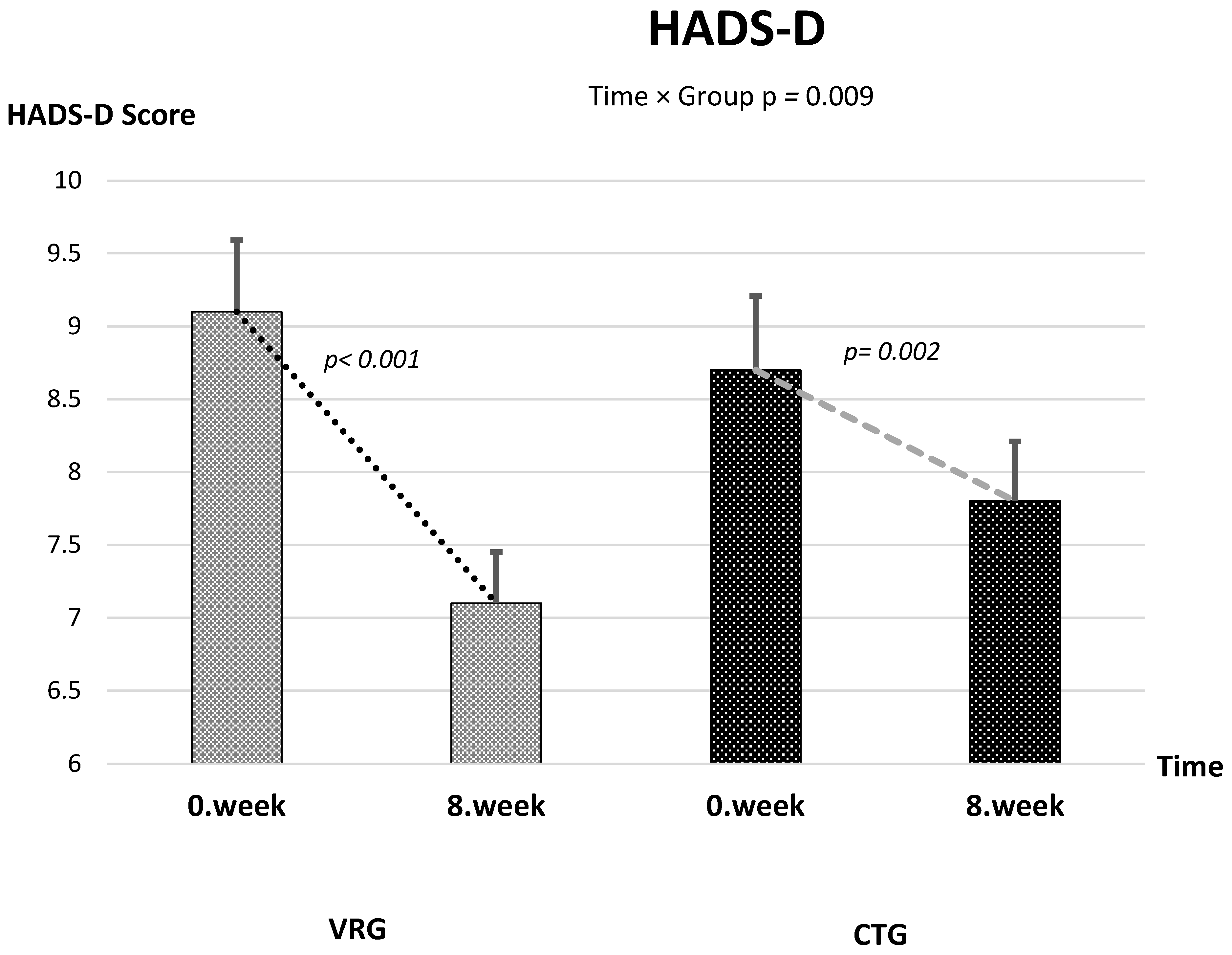 | HADS-D | 9.1 (3.0) | 8.7 (3.1) | 7.1 (2.1) | 7.8 (2.5) | −2.00 ± 2.30 | −0.84 ± 1.21 |