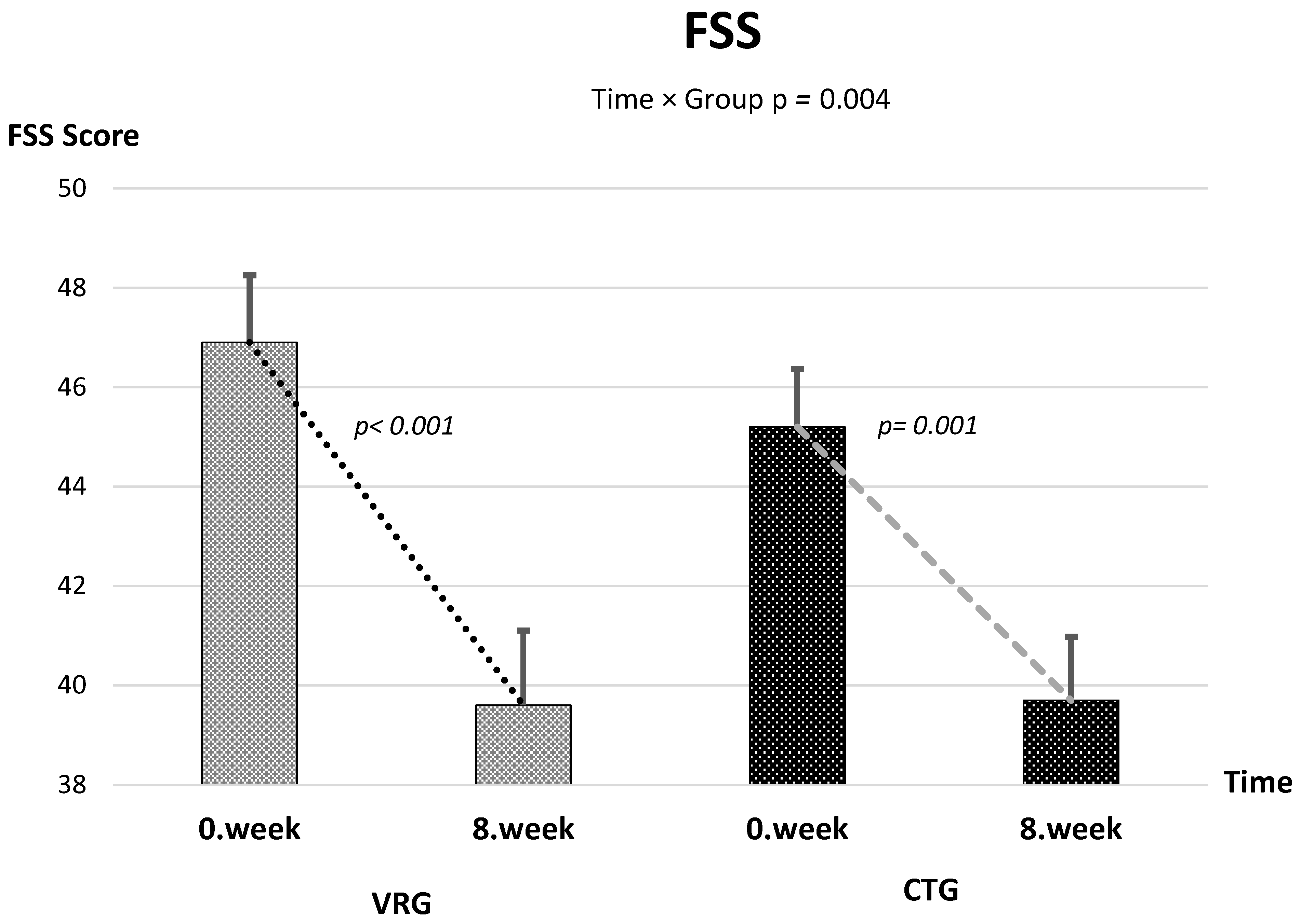 | FSS | 46.9 (8.2) | 45.2 (7.1) | 39.6 (9.1) | 39.7 (7.8) | −8.16 ± 6.70 | −3.97 ± 4.61 |