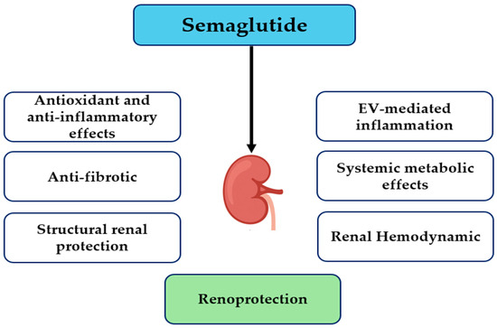 Extending from these intracellular and metabolic effects, semaglutide may also influence intercellular communication pathways that contribute to DKD progression. Moreover, recent evidence indicates that endothelial-derived extracellular vesicles (EVs) contribute to macrophage activation and upregulation of pro-inflammatory cytokines in diabetic tissues, implicating EV-mediated inflammatory signaling in the propagation of chronic inflammation. This identifies EVs as critical intermediaries linking endothelial dysfunction with immune activation, representing an emerging mechanistic insight in diabetes and its complications [44].
