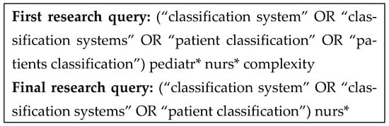 So, the final query for the three databases was as follows: (“classification system” OR “classification systems” OR “patient classification”) nurs* (Figure 2).